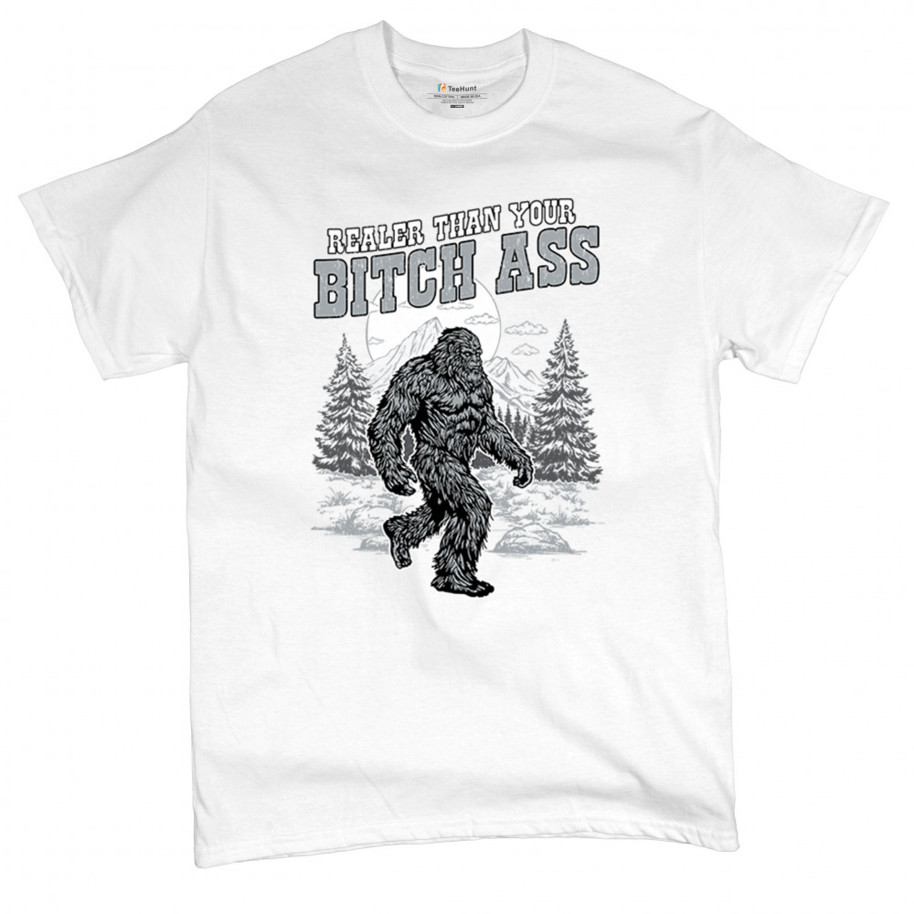 Edgy Bigfoot design with sarcastic cryptid humor and gritty wilderness style. Great for trolls, jokers, and rugged outdoors fans.