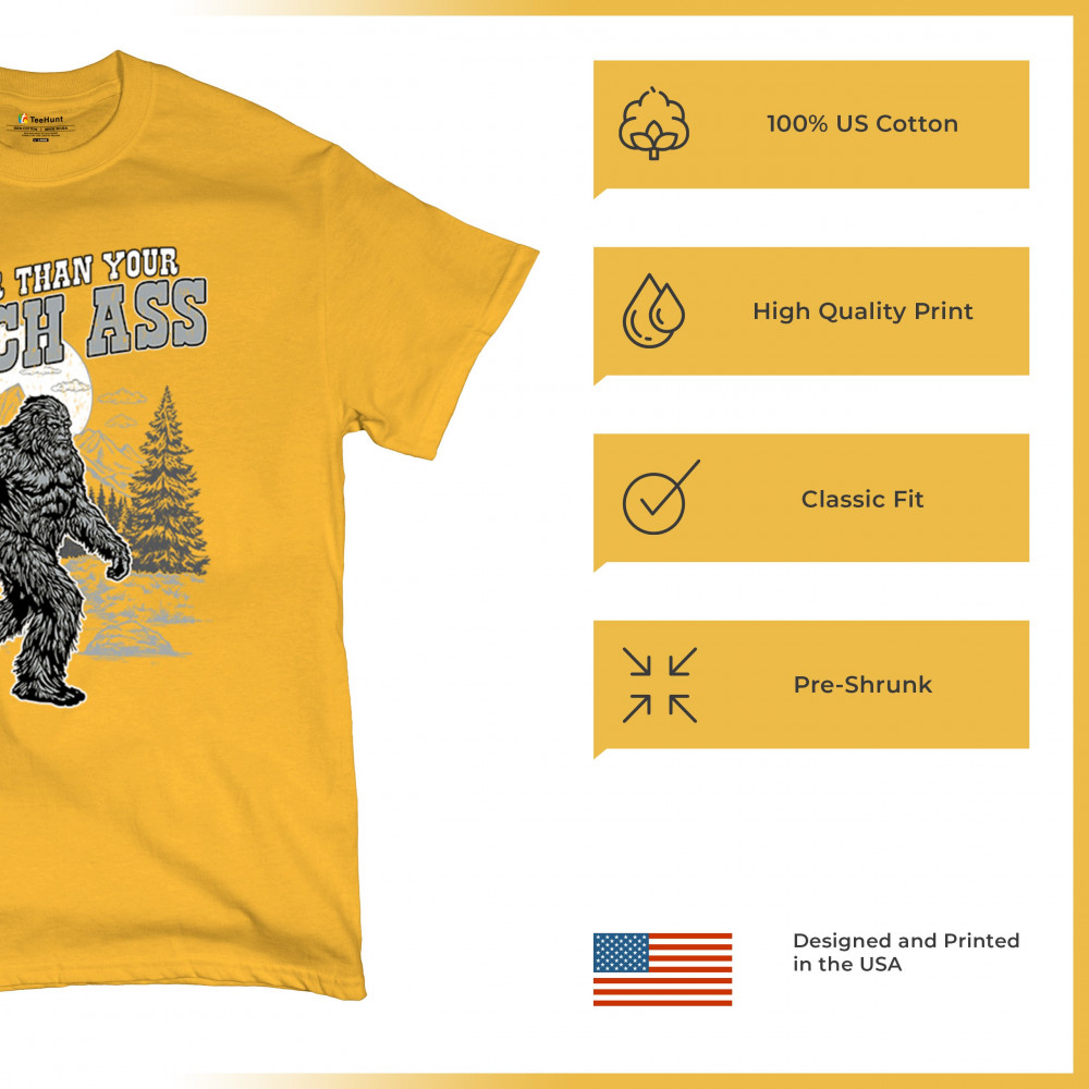 Edgy Bigfoot design with sarcastic cryptid humor and gritty wilderness style. Great for trolls, jokers, and rugged outdoors fans.