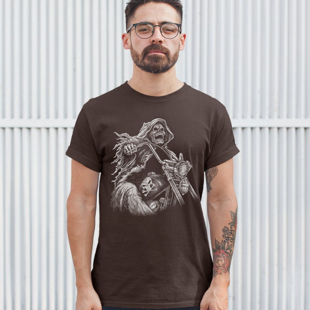 REAPER BIKER t-shirt ride or die skeleton biker forever motorcycle men's tee brown