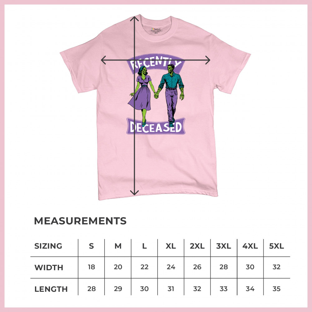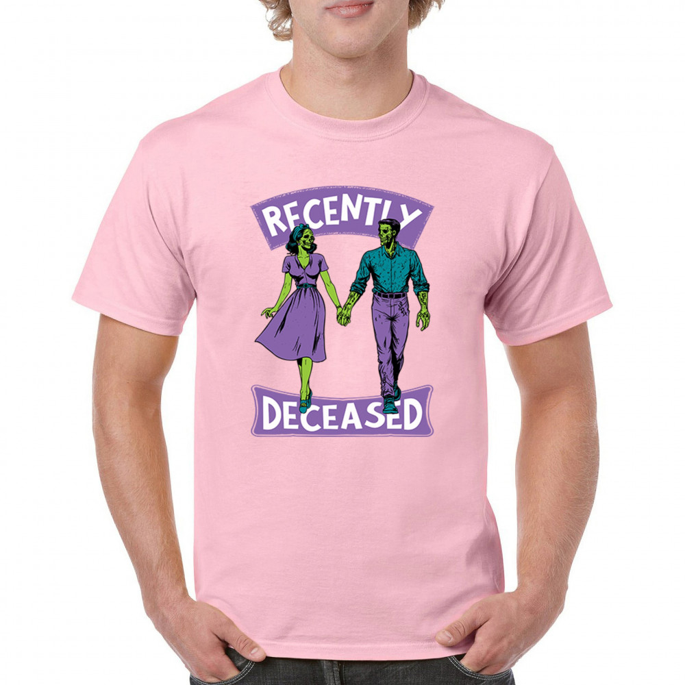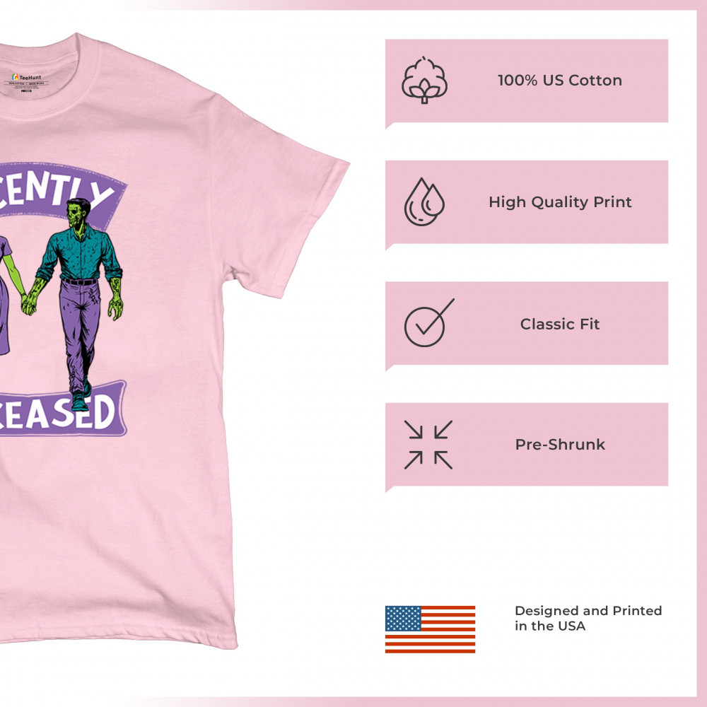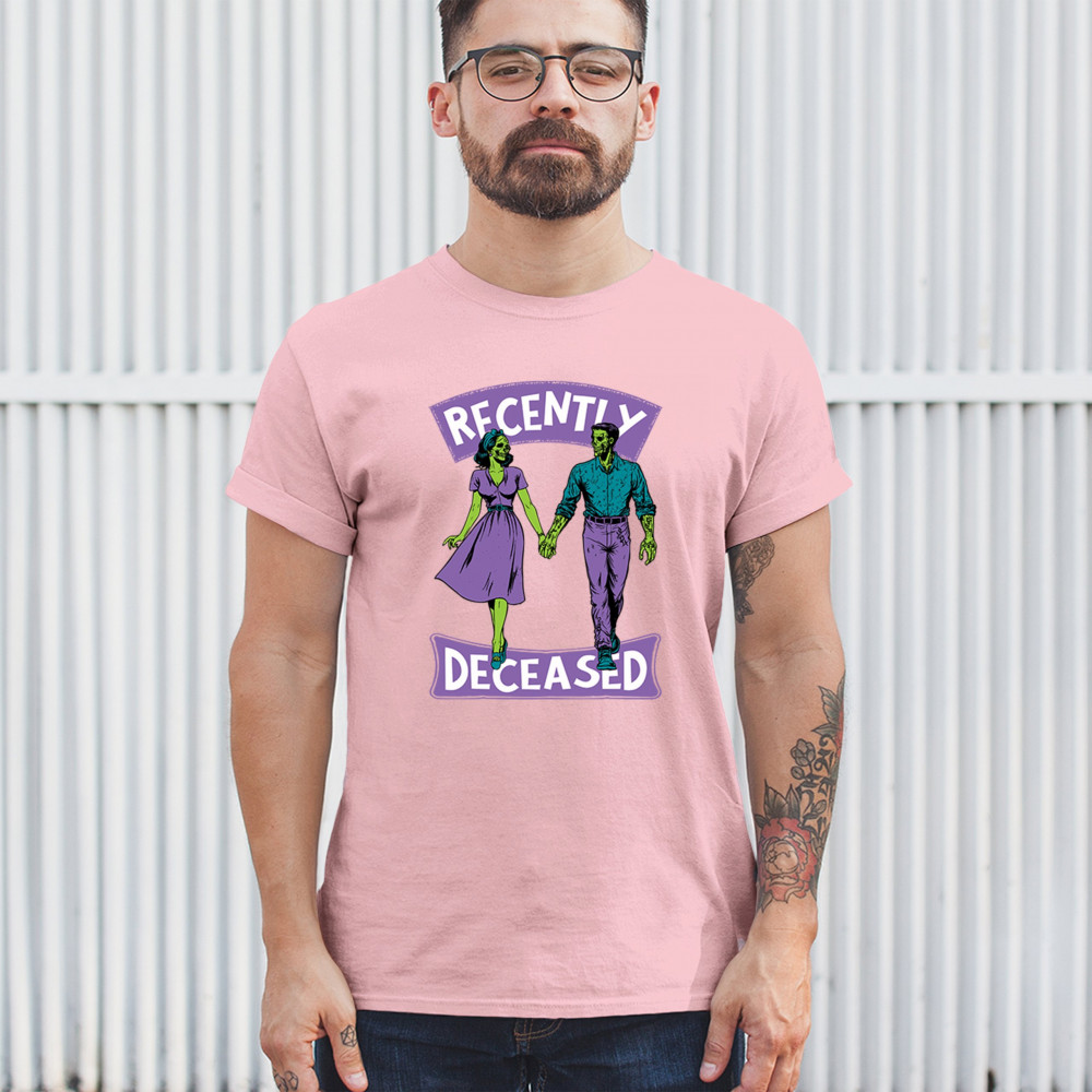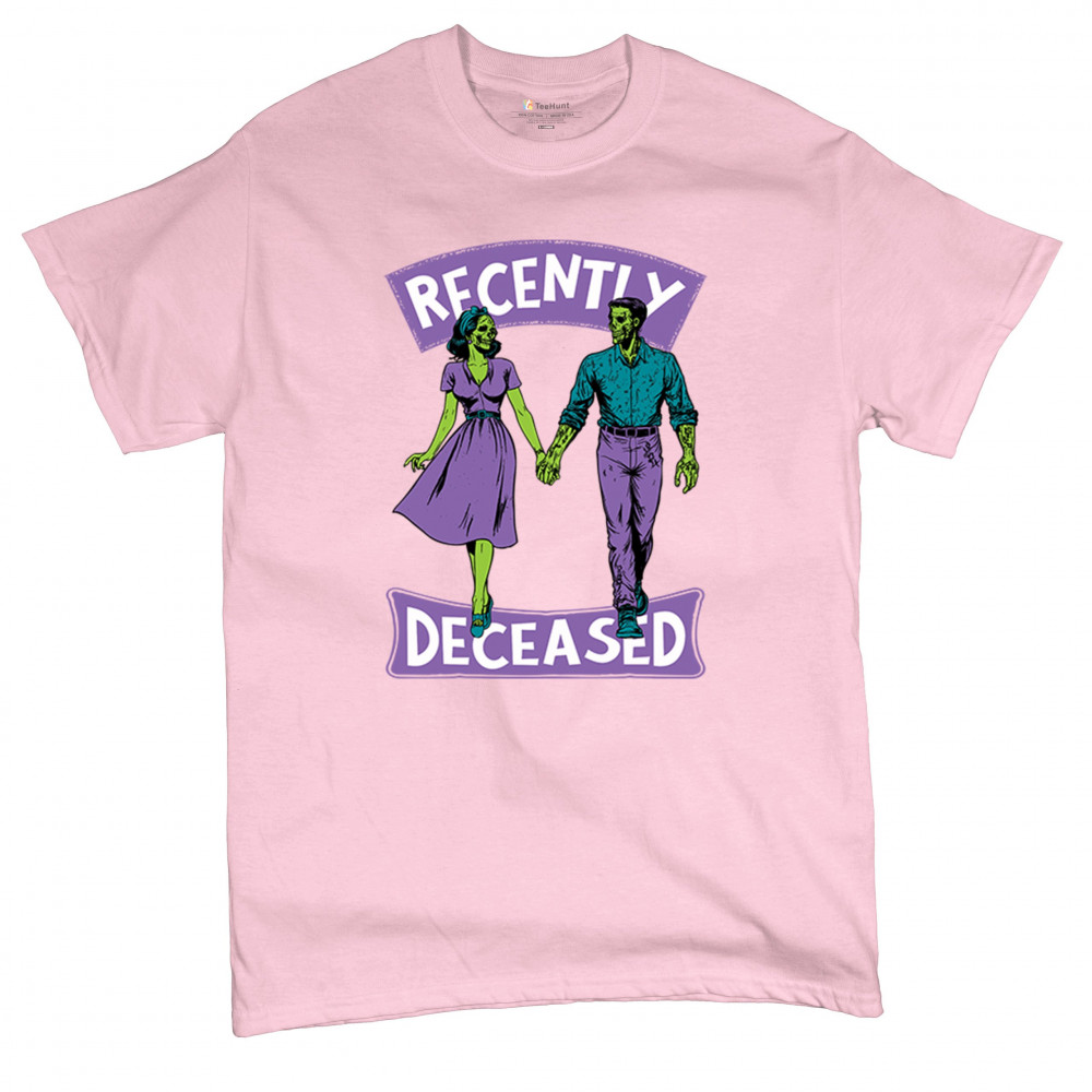 Recently Deceased zombie couple shirt with undead lovers design, spooky season humor, Halloween zombie outfit, and haunted house vibes.