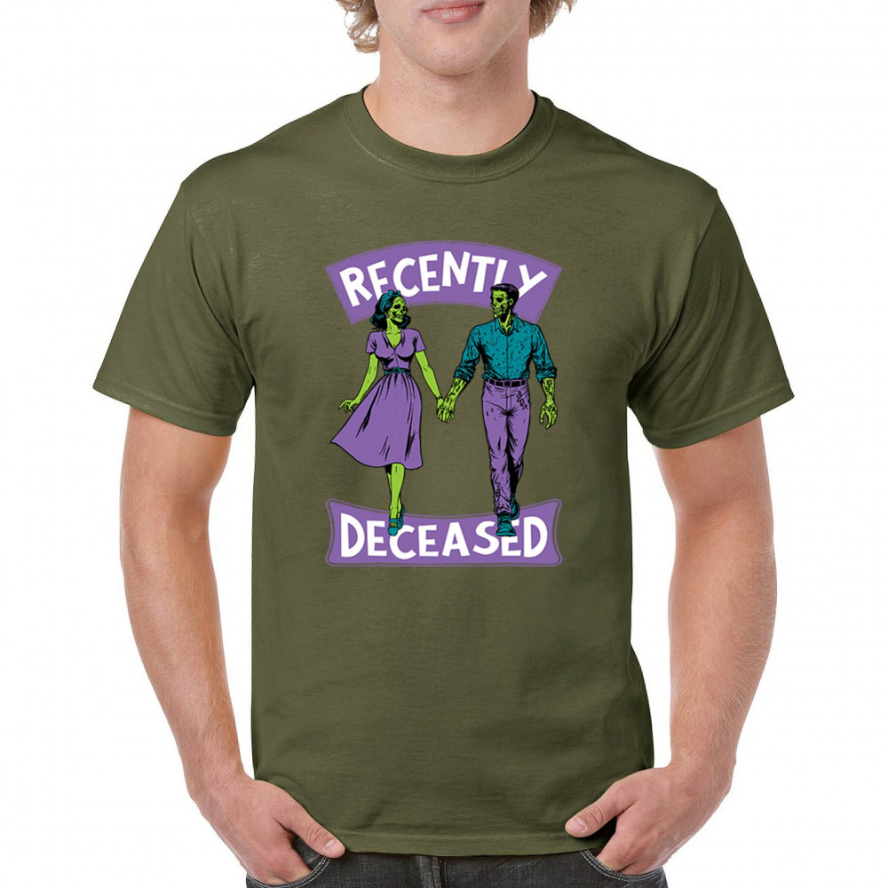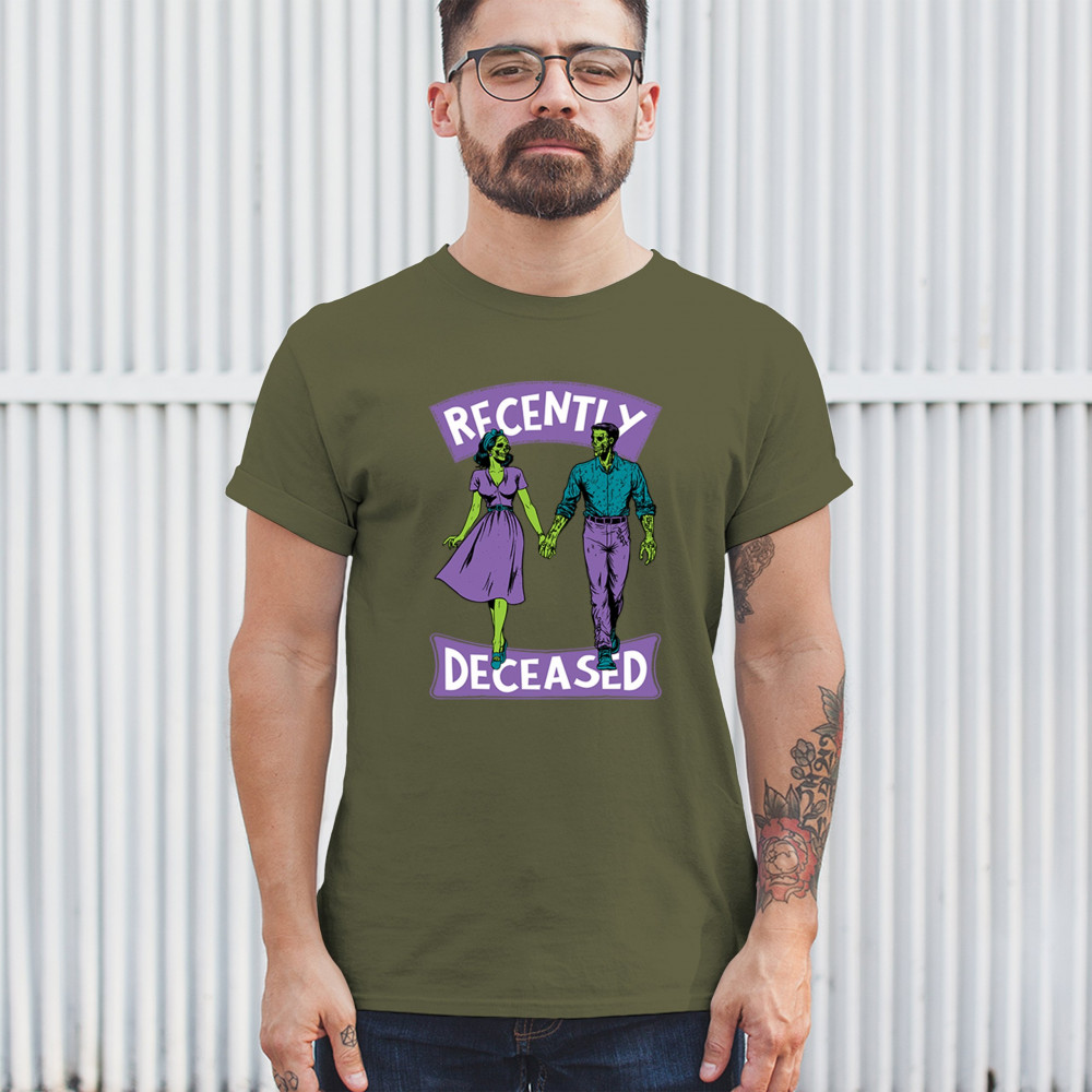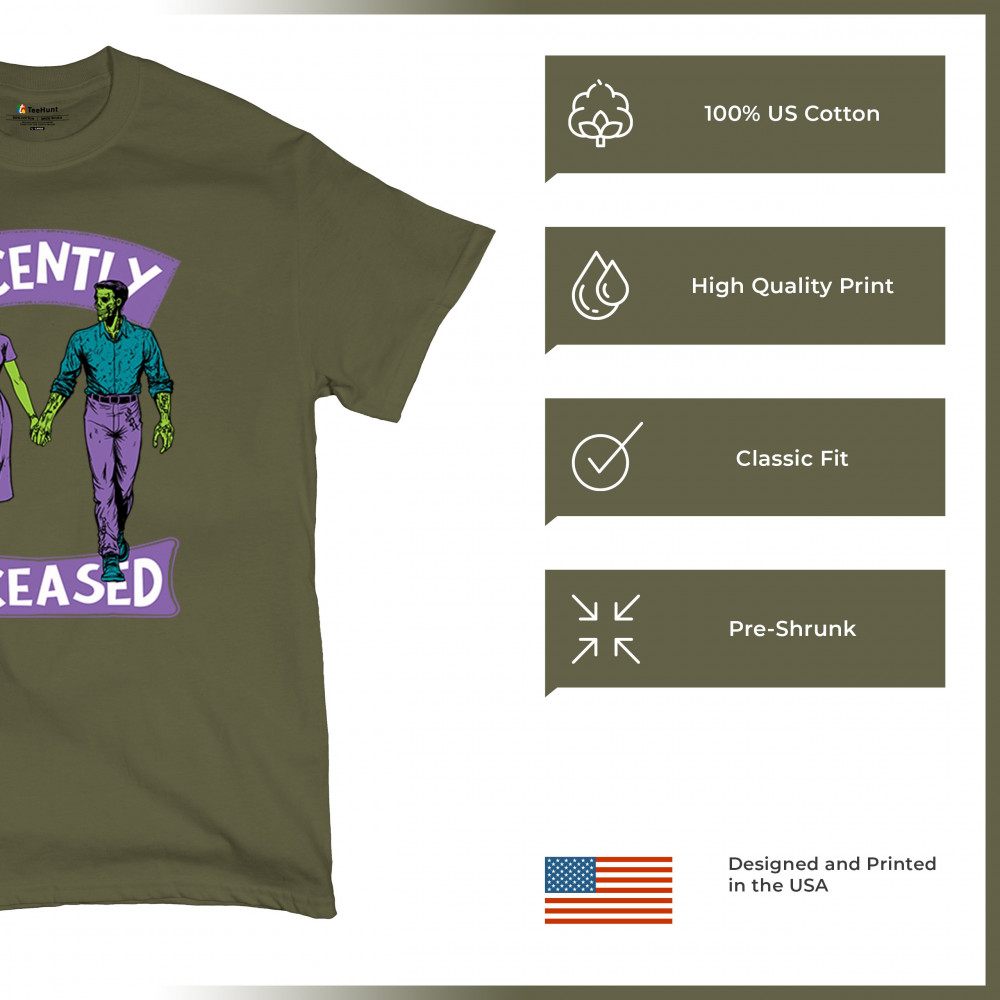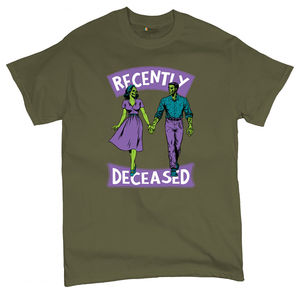 Recently Deceased zombie couple shirt with undead lovers design, spooky season humor, Halloween zombie outfit, and haunted house vibes.