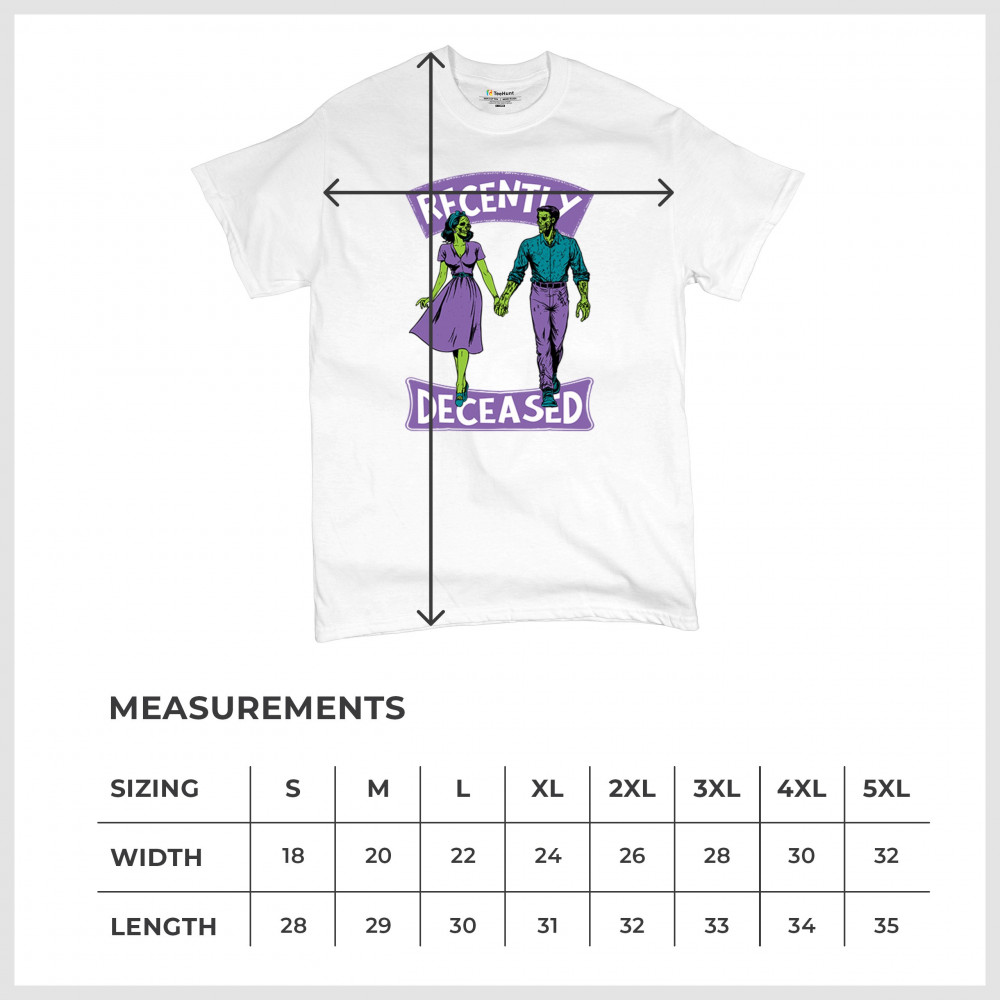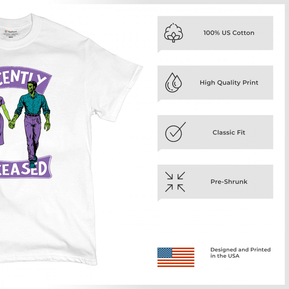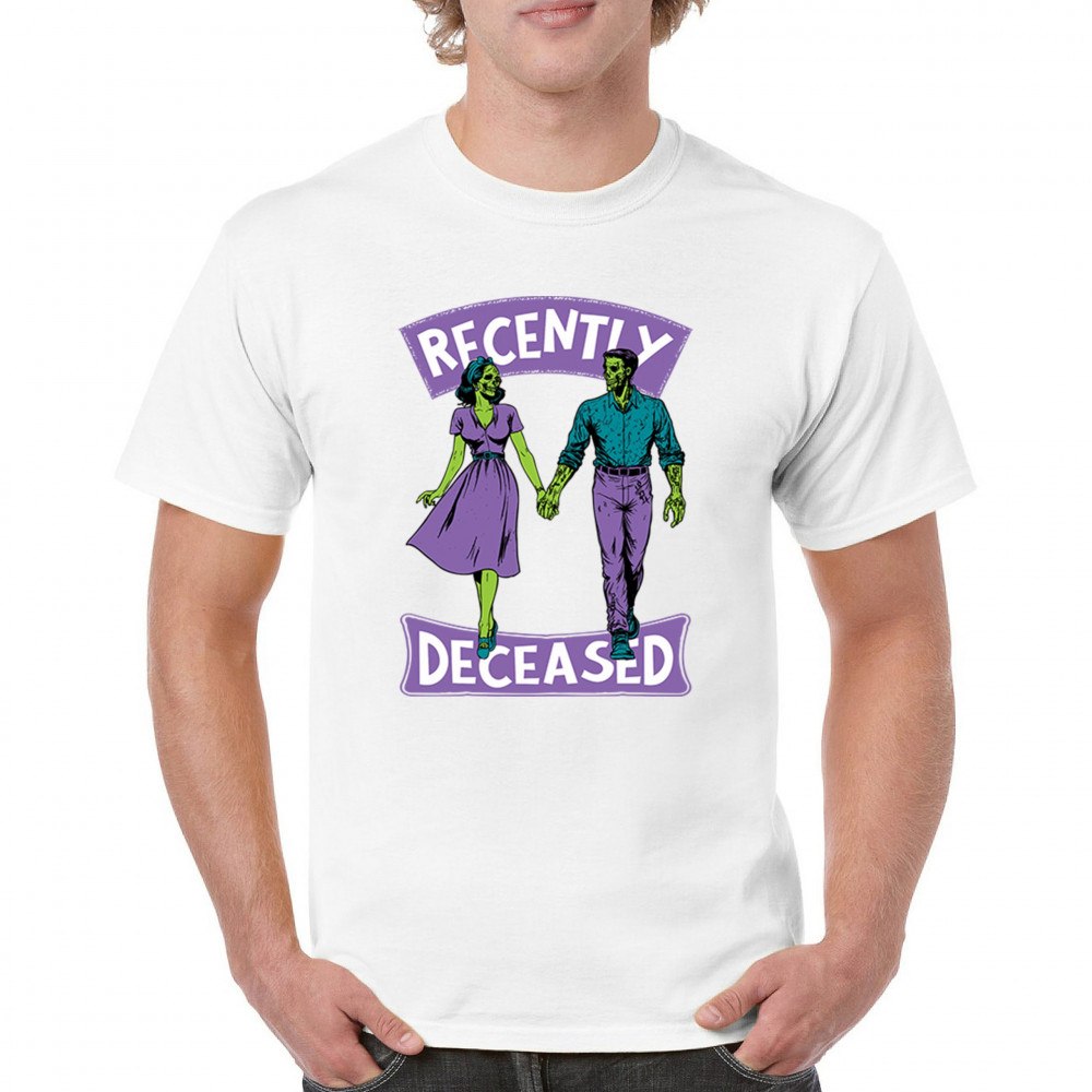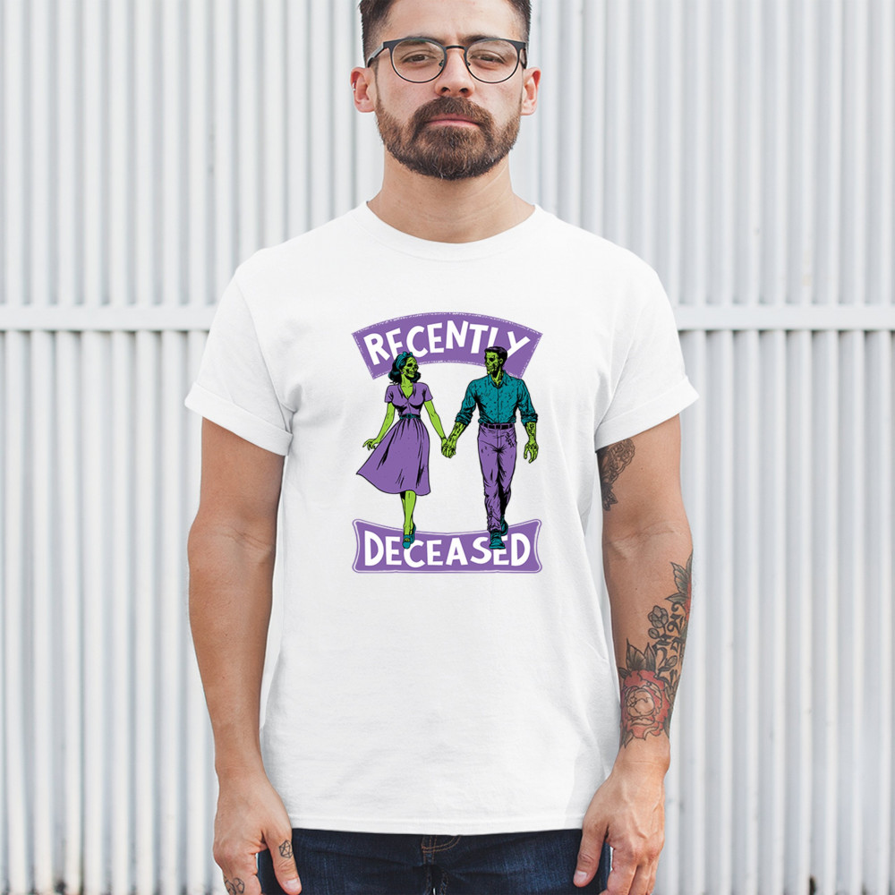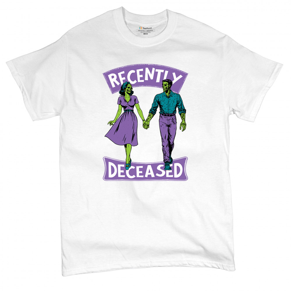 Recently Deceased zombie couple shirt with undead lovers design, spooky season humor, Halloween zombie outfit, and haunted house vibes.