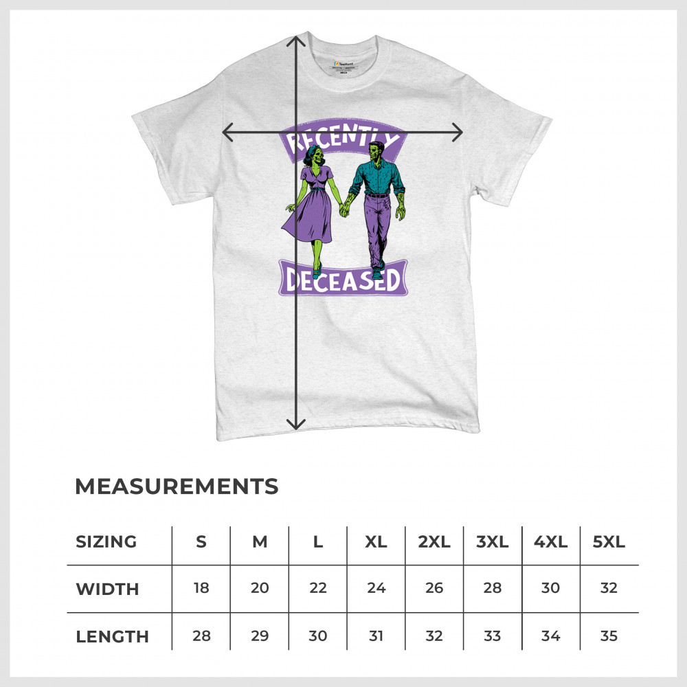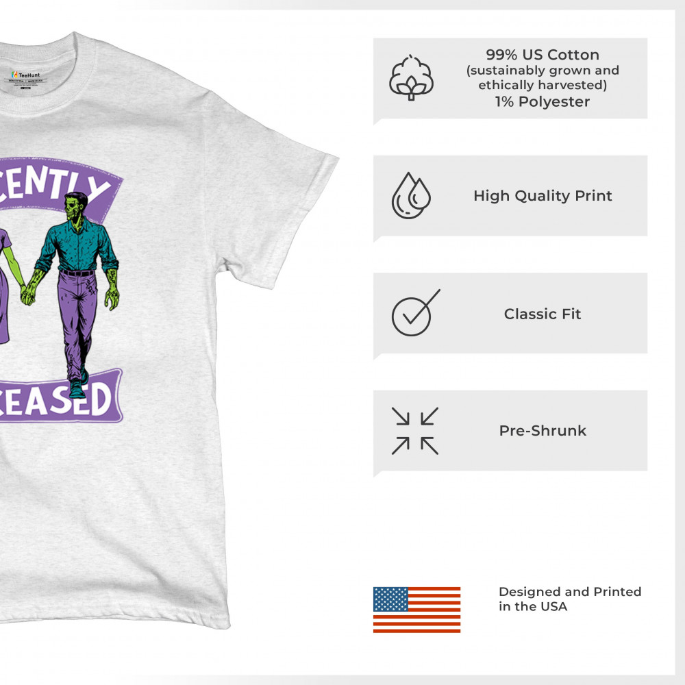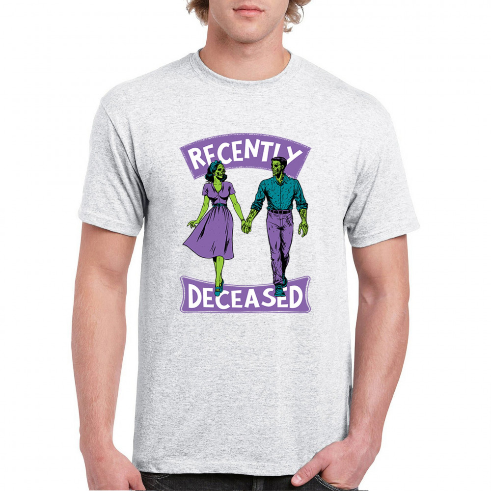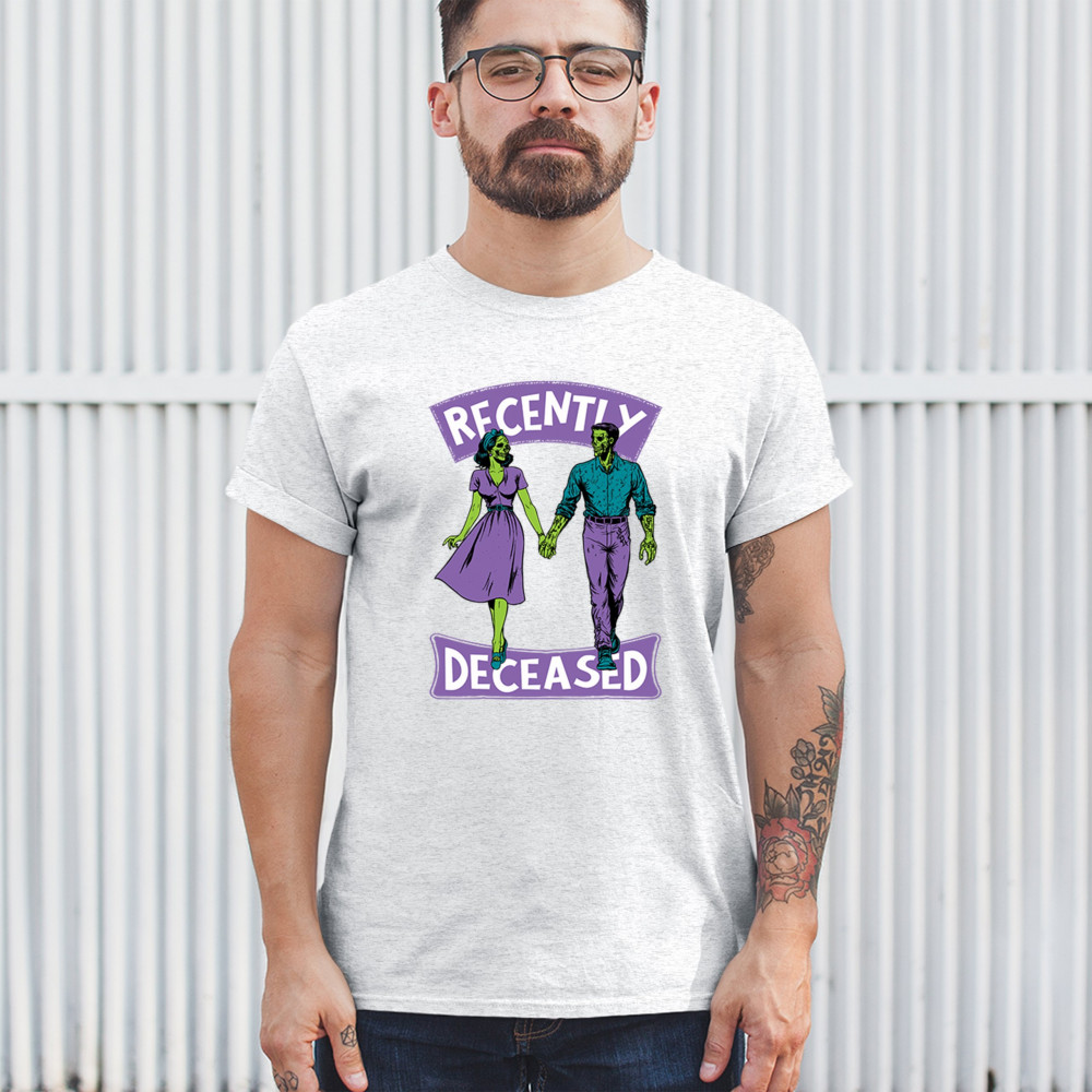 Recently Deceased zombie couple shirt with undead lovers design, spooky season humor, Halloween zombie outfit, and haunted house vibes.