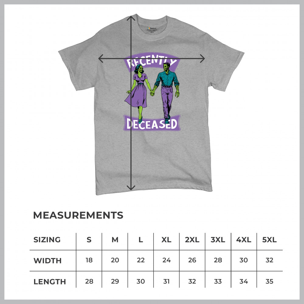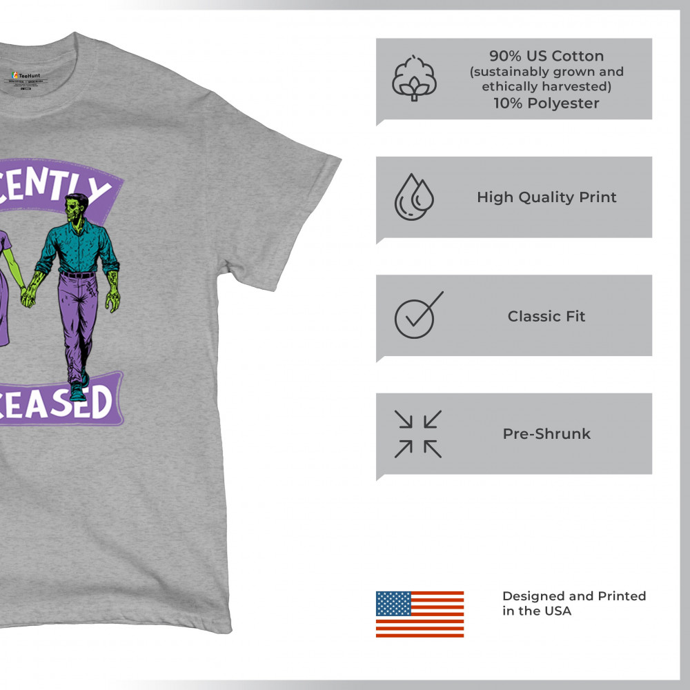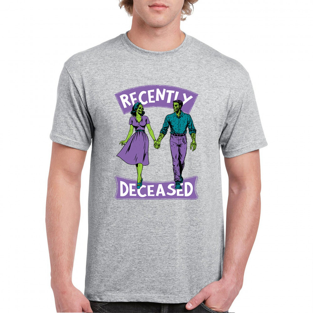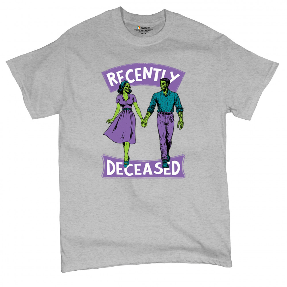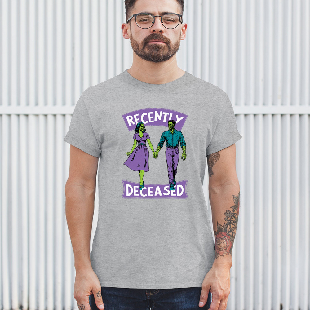 Recently Deceased zombie couple shirt with undead lovers design, spooky season humor, Halloween zombie outfit, and haunted house vibes.