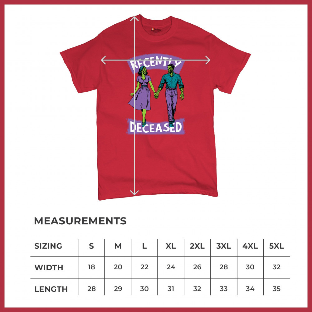 Recently Deceased zombie couple shirt with undead lovers design, spooky season humor, Halloween zombie outfit, and haunted house vibes.