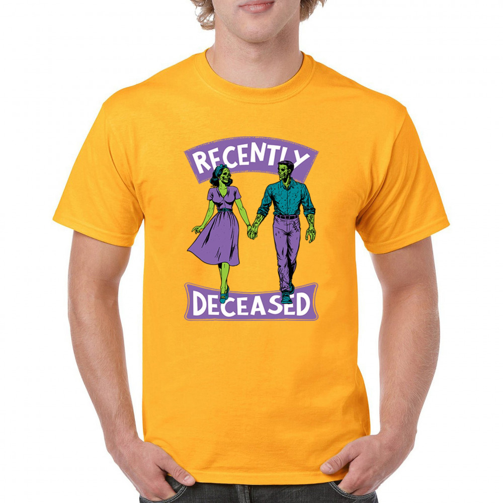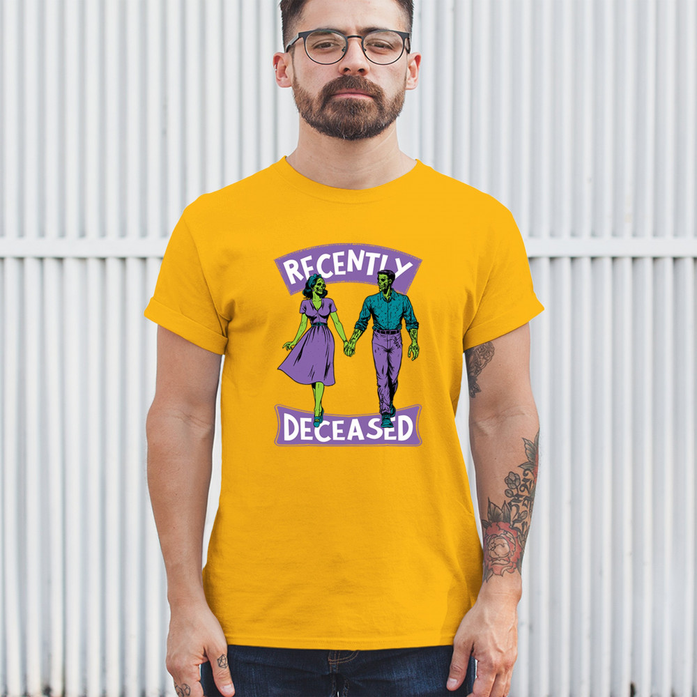 Recently Deceased zombie couple shirt with undead lovers design, spooky season humor, Halloween zombie outfit, and haunted house vibes.