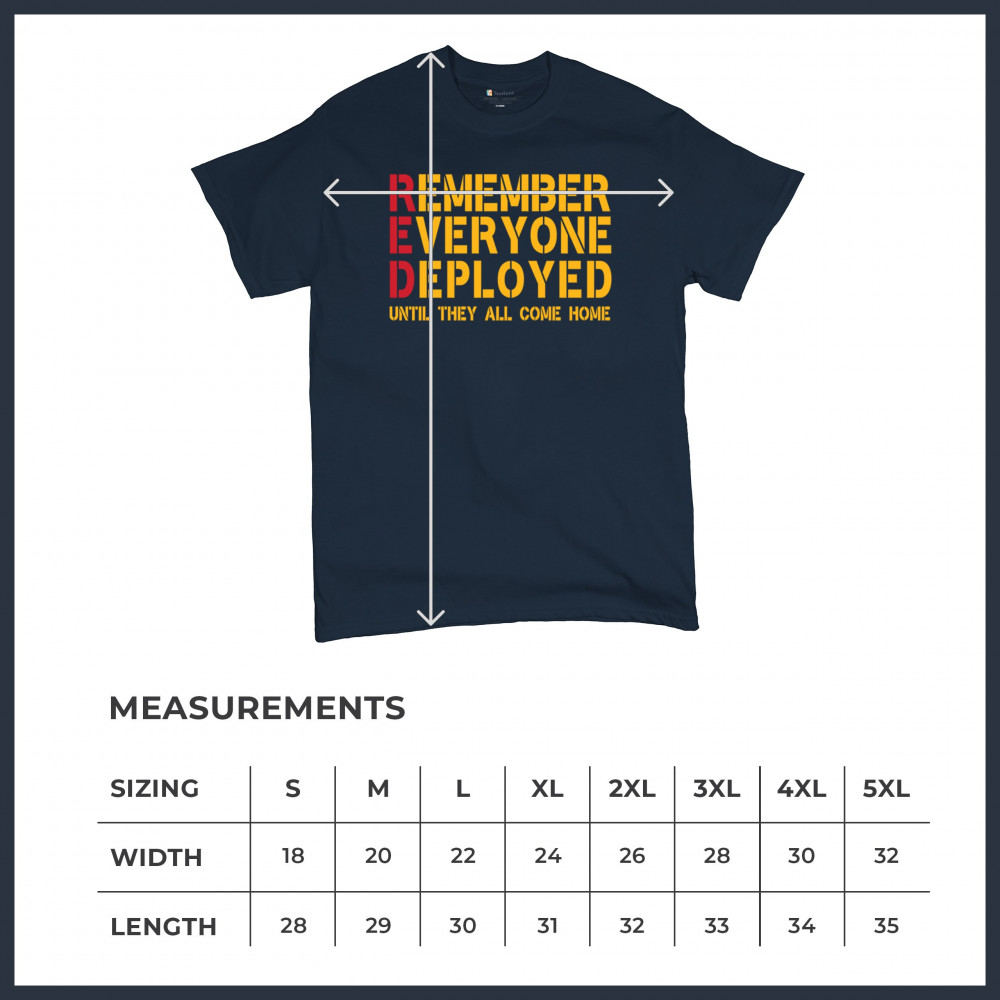 Show your support for our deployed troops with this "Remember Everyone Deployed" shirt. The bold and striking design is perfect for expressing your patriotic pride and honoring those who serve. Made from soft and durable materials, this shirt is ideal for everyday wear or special occasions like Veterans Day, Memorial Day, and the Fourth of July. Whether you're participating in a community event, attending a parade, or just want to show your appreciation, this shirt is a great choice. It also makes a thoughtful gift for anyone who supports our military heroes.
