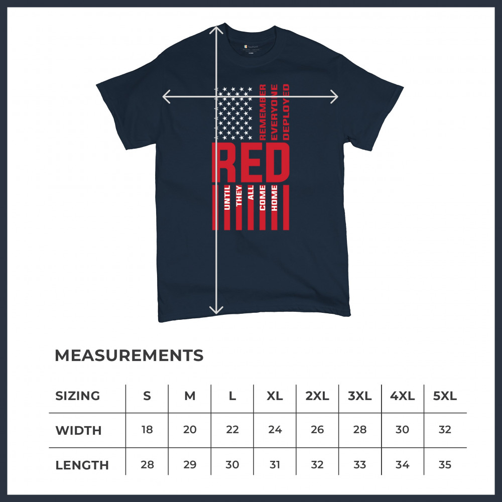 Express your support for our brave soldiers with the "RED - Remember Everyone Deployed" design. This patriotic and impactful design serves as a powerful reminder to keep our troops in our thoughts until they safely return home. Ideal for patriotic events, military gatherings, and daily wear, this design allows you to visibly show your gratitude and support for those who serve. Add this meaningful design to your collection and stand in solidarity with our troops.