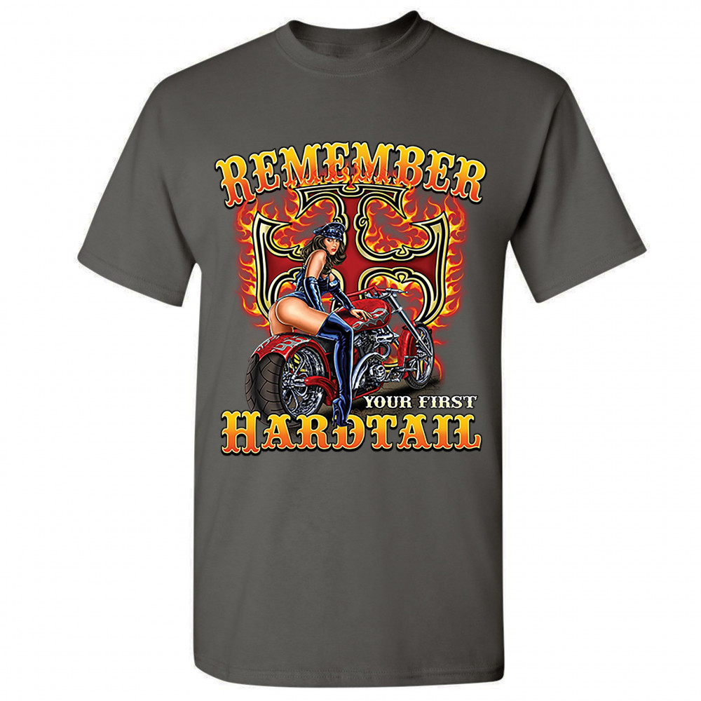 REMEMBER YOUR FIRST HARDTAIL t-shirt biker babe motorcycle chopper men's tee charcoal