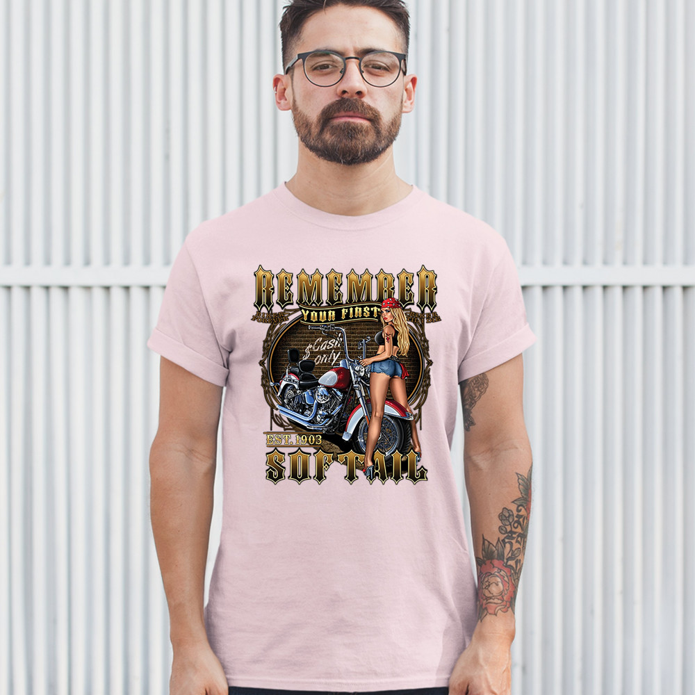 REMEMBER YOUR FIRST SOFTAIL t-shirt mc biker forever pin-up girl men's tee light pink