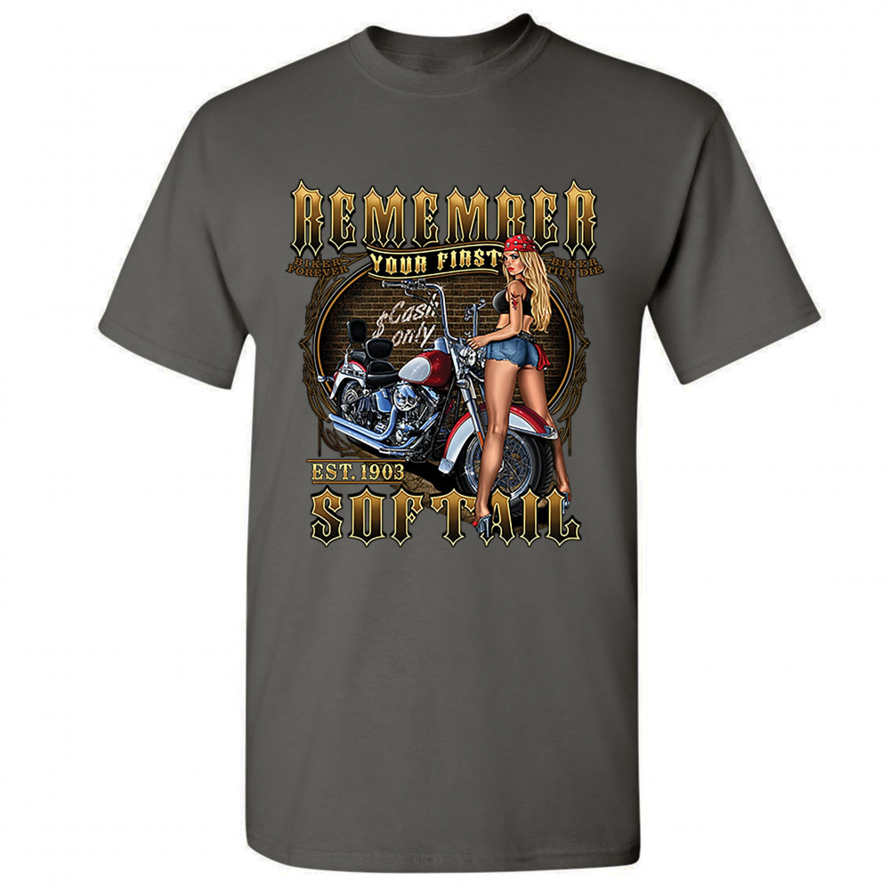 A print featuring a sexy pin-up girl in daisy dukes standing in front of a motorcycle. In the background there is a brick wall with "$ cash only" written on it. The print says: "Remember your first softail, biker forever, biker til i die, est. 1903". A gr