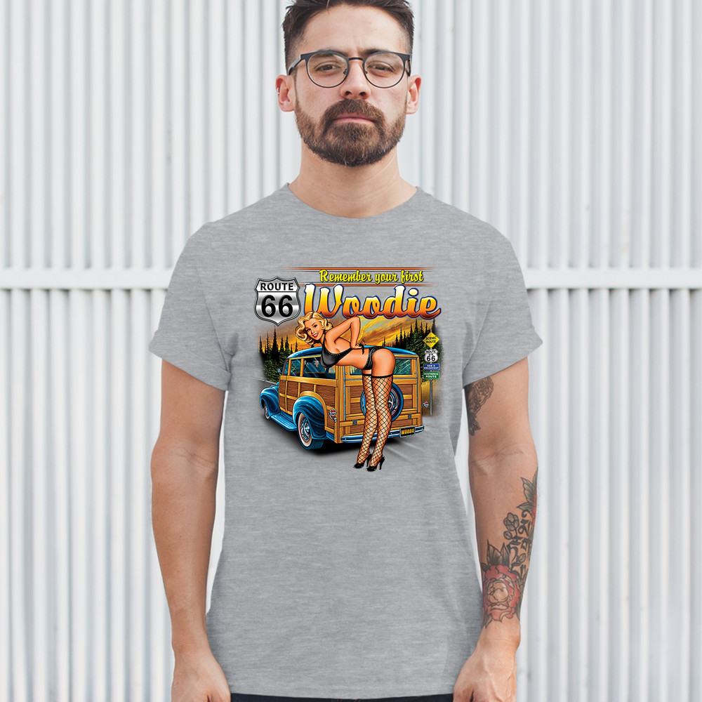 A print featuring a sexy blonde pin-up girl bending over and taking off her bra. Behind her there is a woodie wagon driving on a road. The print says: "Remeber your first woodie" and features a Route 66. A great choice for a fan of the legendary Mother Ro