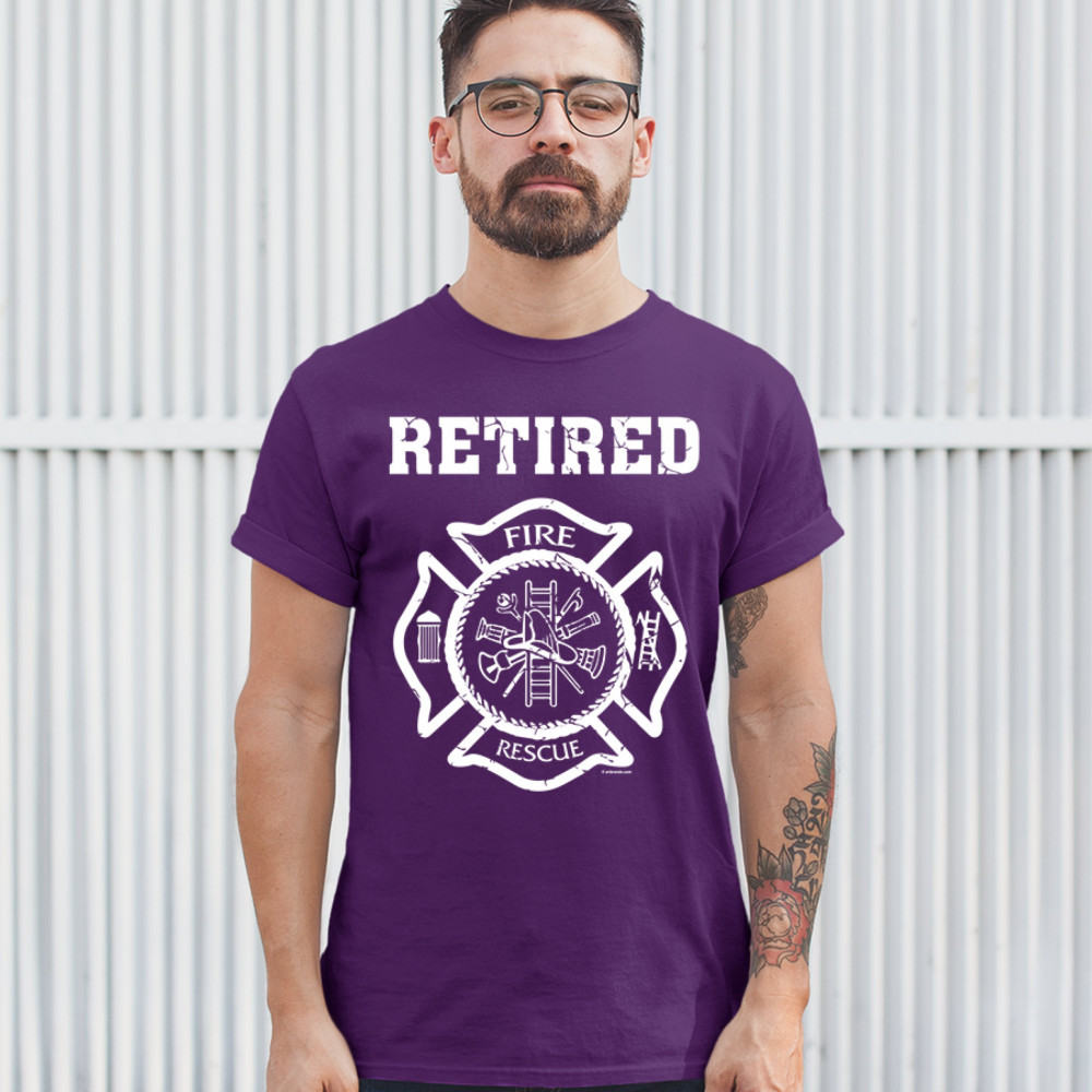 RETIRED FIREFIGHTER BADGE t-shirt fire and rescue fire department men's tee purple