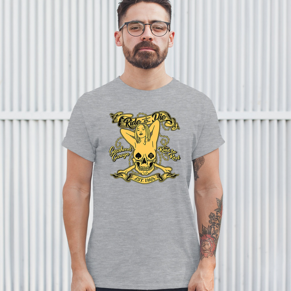 A print featuring a naked woman with her hands behind her head and spades as nipple covers. Her body is mixed with a skull. There are crossed bones and multiple chains in the background. The print says: "Ride or Die, Gearhead Garage, Rust to Rod, Est. 196