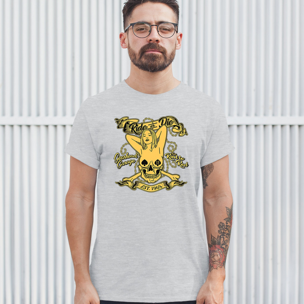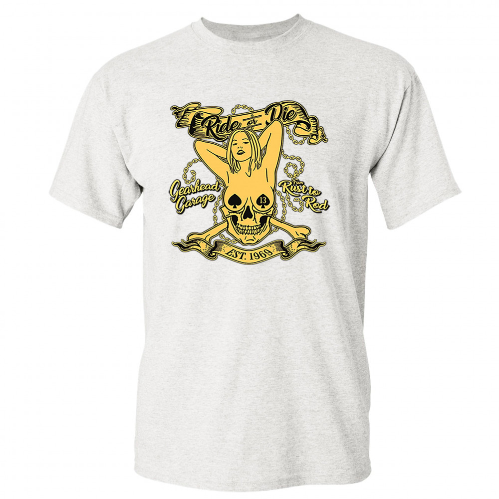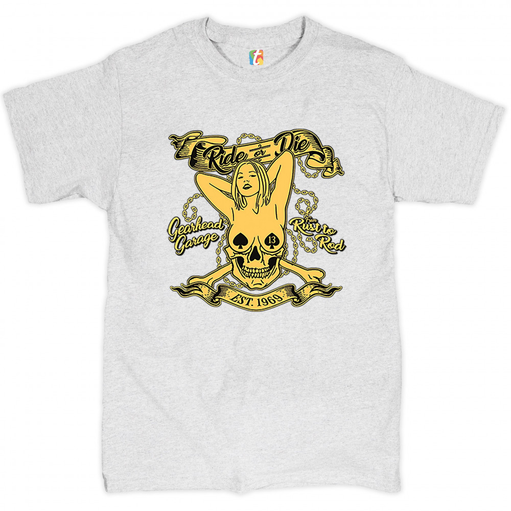 A print featuring a naked woman with her hands behind her head and spades as nipple covers. Her body is mixed with a skull. There are crossed bones and multiple chains in the background. The print says: "Ride or Die, Gearhead Garage, Rust to Rod, Est. 196
