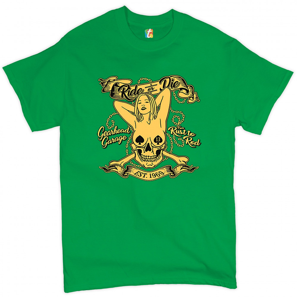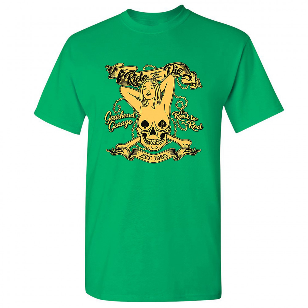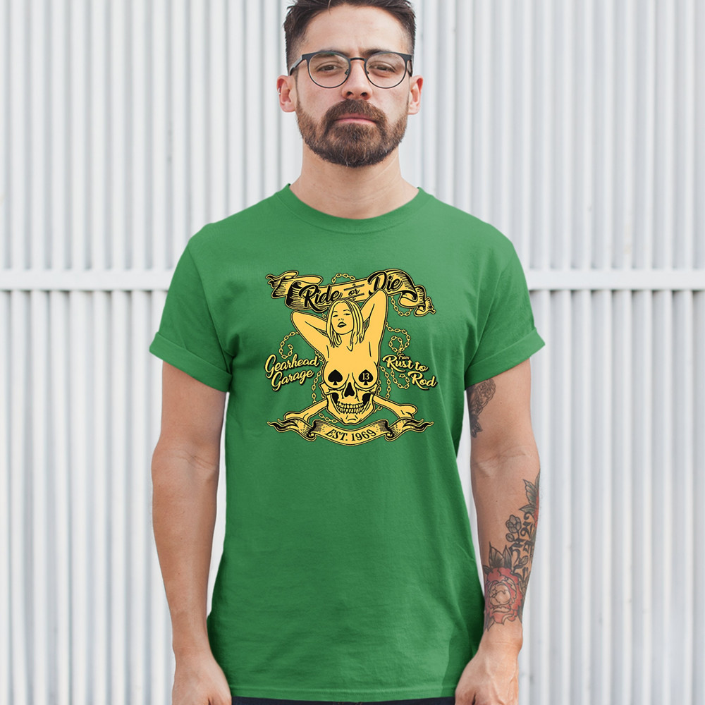 A print featuring a naked woman with her hands behind her head and spades as nipple covers. Her body is mixed with a skull. There are crossed bones and multiple chains in the background. The print says: "Ride or Die, Gearhead Garage, Rust to Rod, Est. 196