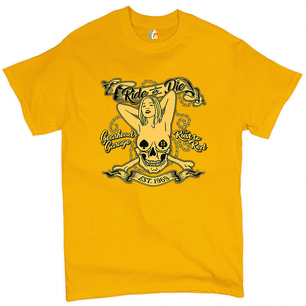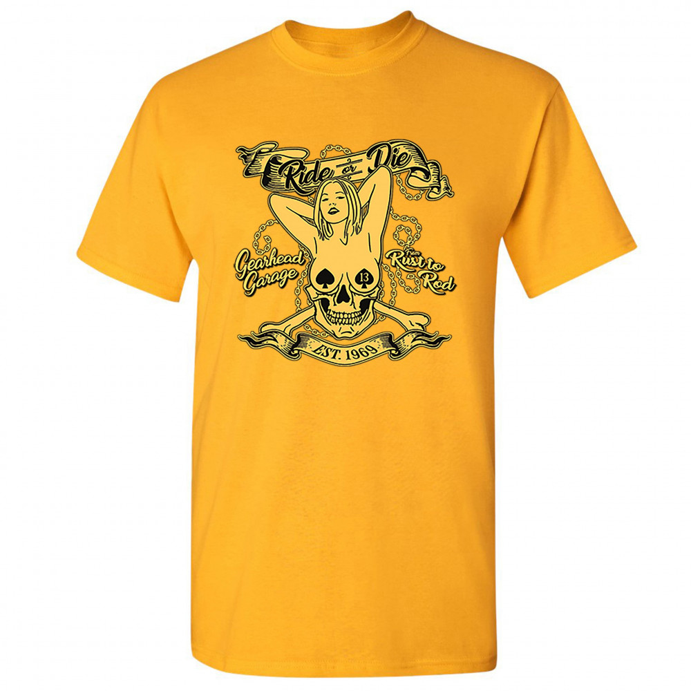 A print featuring a naked woman with her hands behind her head and spades as nipple covers. Her body is mixed with a skull. There are crossed bones and multiple chains in the background. The print says: "Ride or Die, Gearhead Garage, Rust to Rod, Est. 196