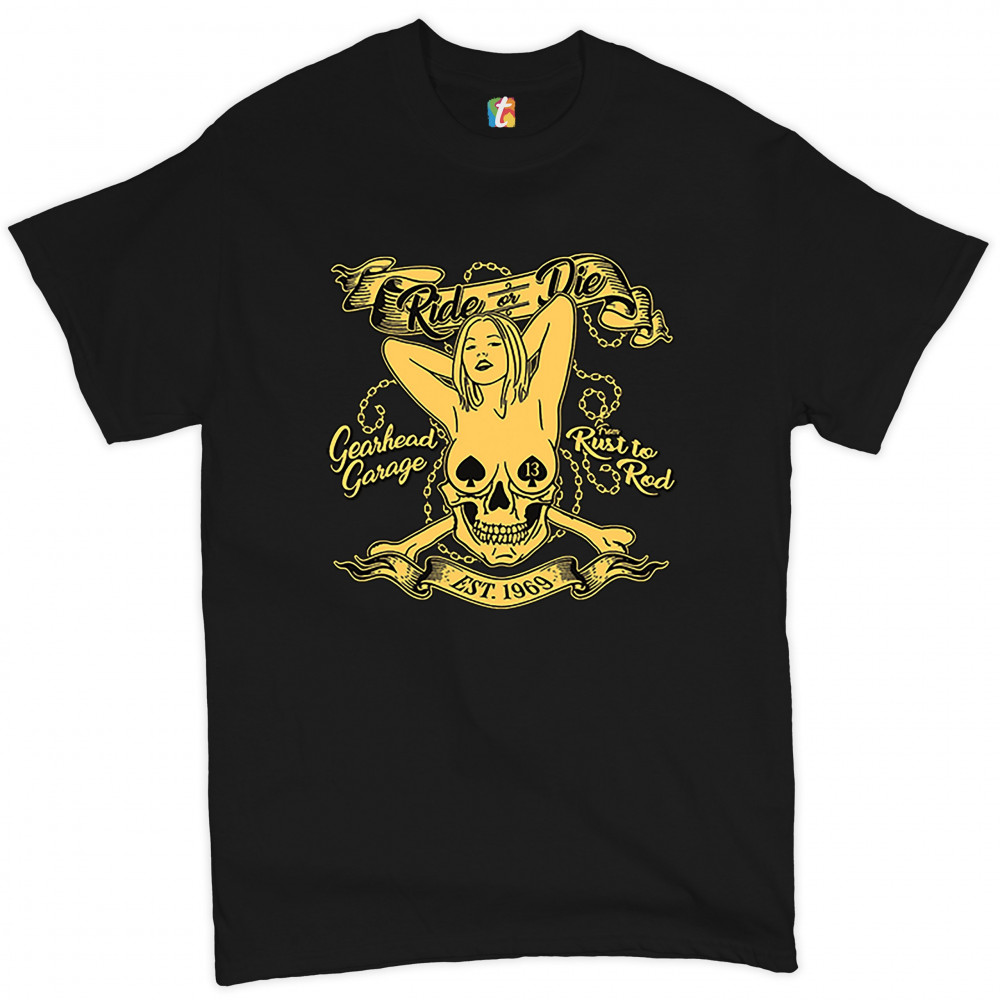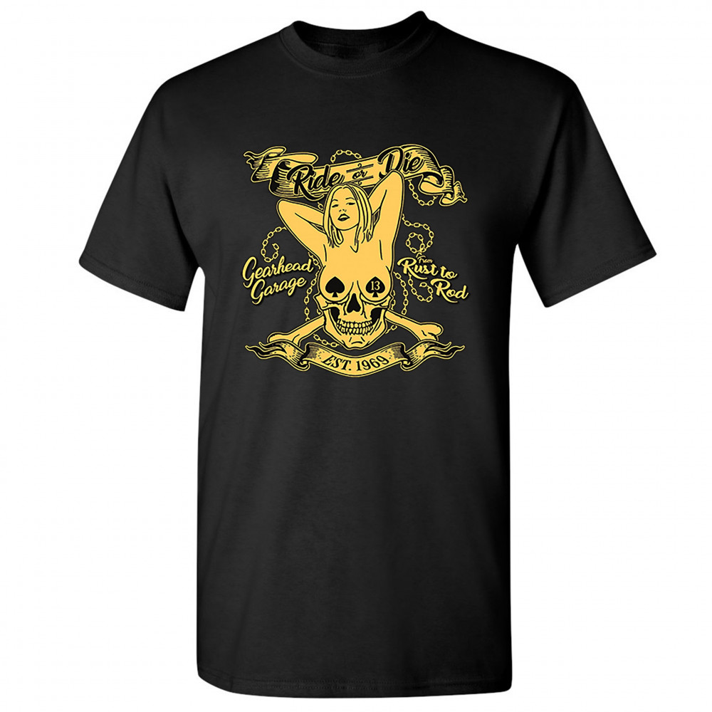 RIDE OR DIE t-shirt gearhead garage from rust to rod biker babe men's tee black