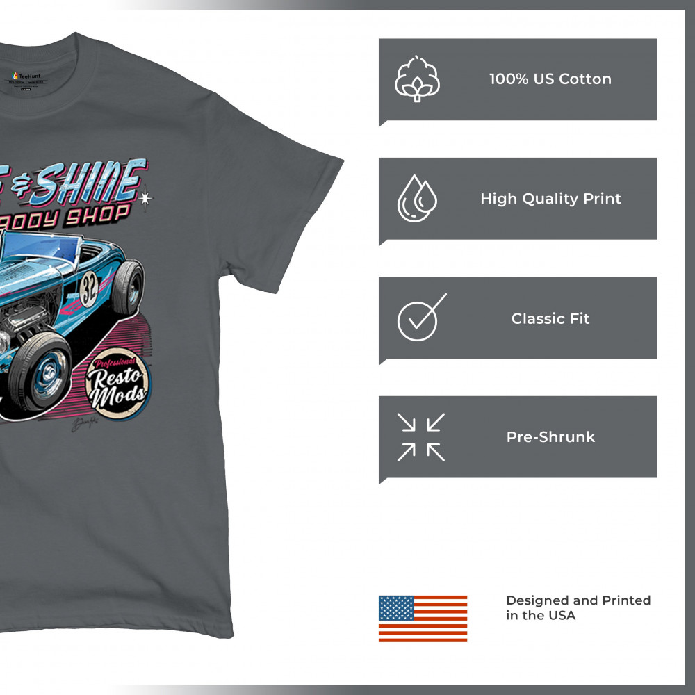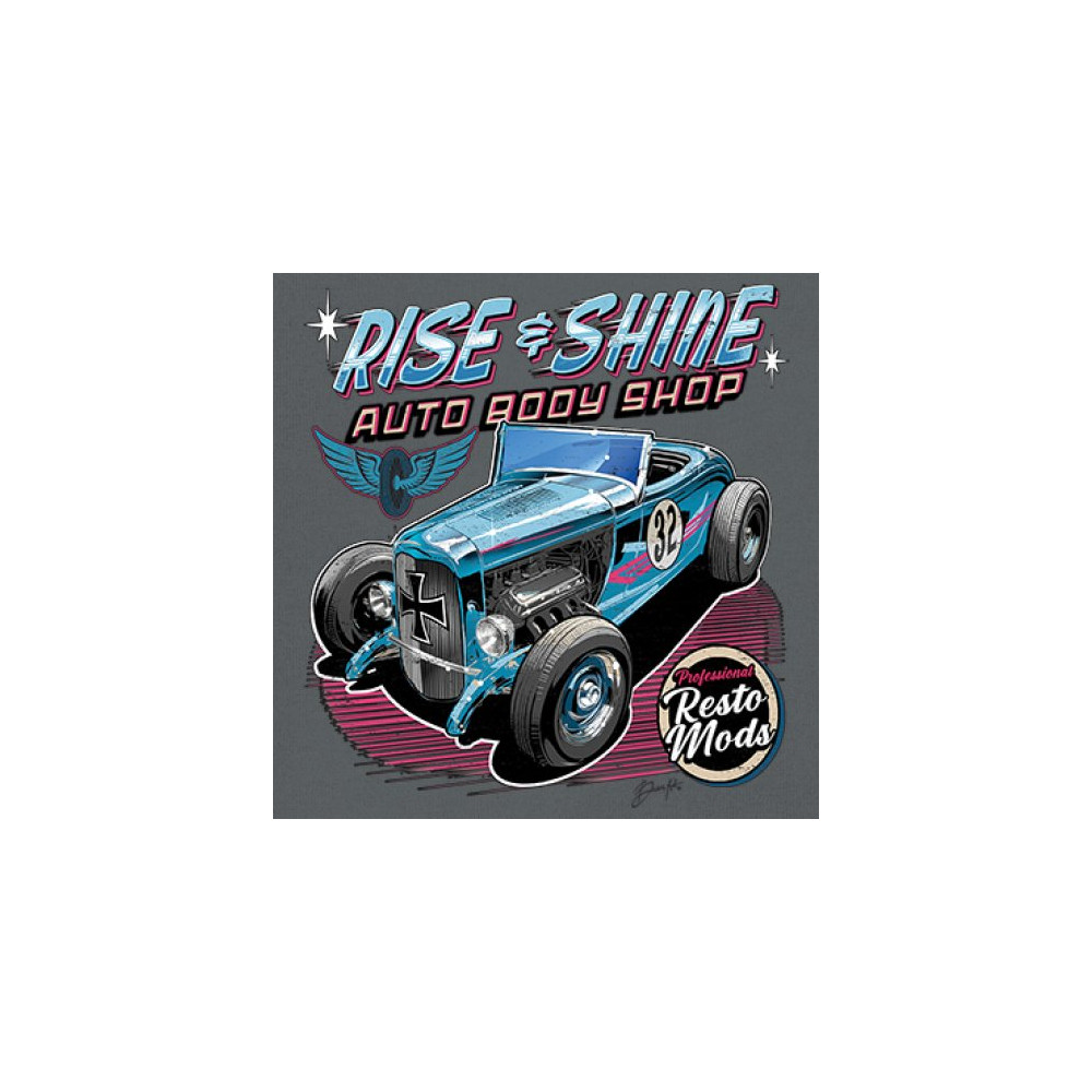 Our "Rise & Shine Auto Body Shop" design is a tribute to classic car culture and professional resto mods. This striking graphic showcases a vintage hot rod, perfect for car enthusiasts and auto restoration fans. Whether you're hitting the car show circuit or working in your garage, this design adds a touch of retro charm to your look. Crafted from premium materials, it offers both comfort and durability, ensuring it stands up to your active lifestyle. Celebrate the art of automotive restoration with this standout design.