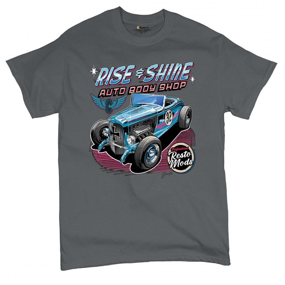 Celebrate vintage car culture with our "Rise & Shine Auto Body Shop" design. Perfect for car enthusiasts and auto restoration fans. Comfortable and durable.