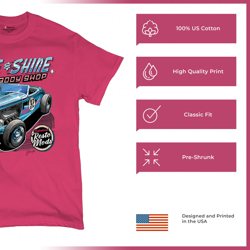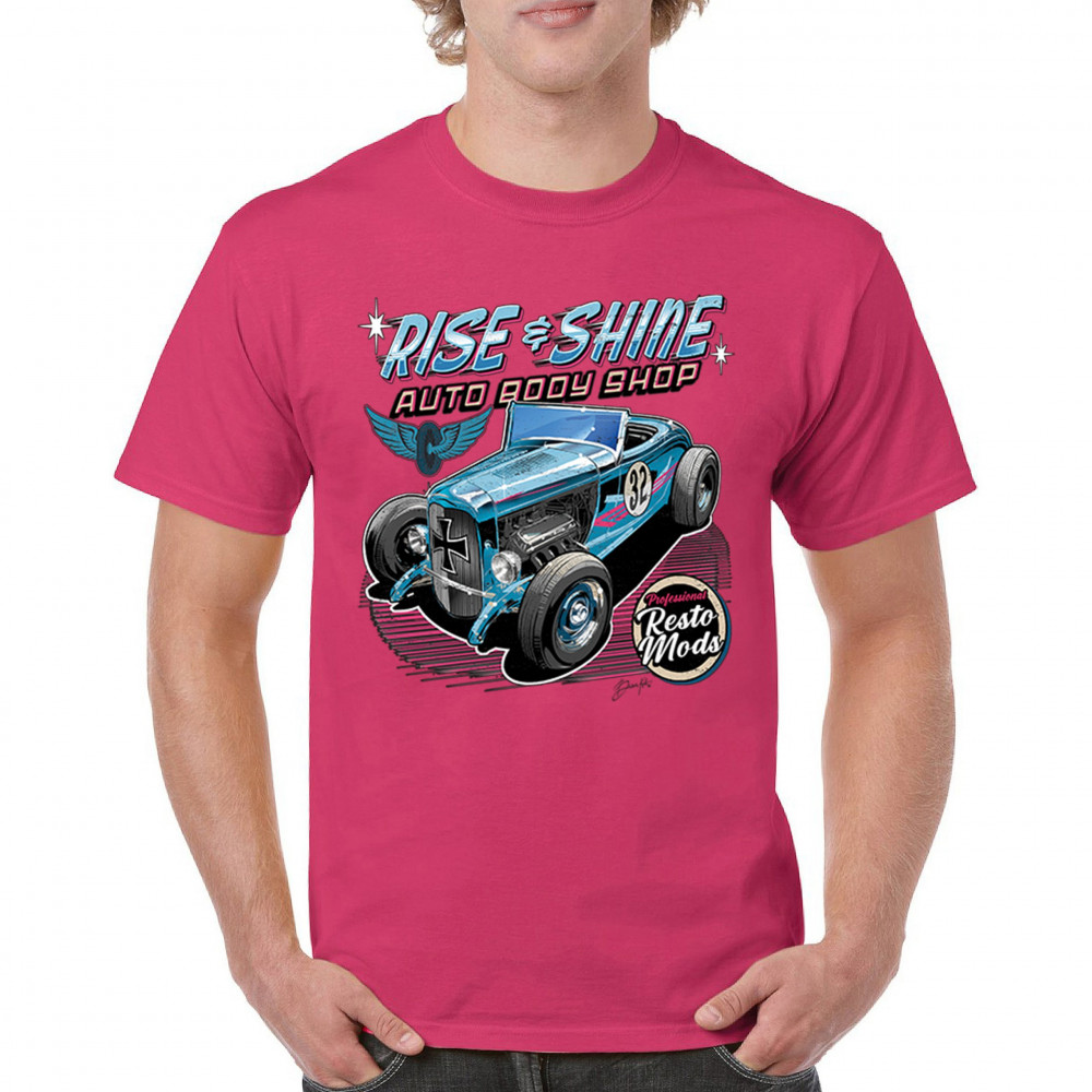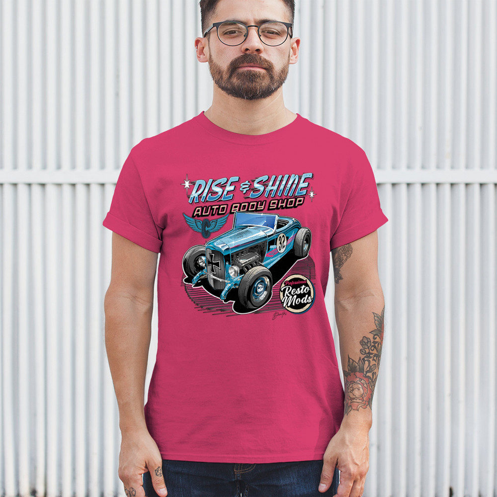 Our "Rise & Shine Auto Body Shop" design is a tribute to classic car culture and professional resto mods. This striking graphic showcases a vintage hot rod, perfect for car enthusiasts and auto restoration fans. Whether you're hitting the car show circuit or working in your garage, this design adds a touch of retro charm to your look. Crafted from premium materials, it offers both comfort and durability, ensuring it stands up to your active lifestyle. Celebrate the art of automotive restoration with this standout design.
