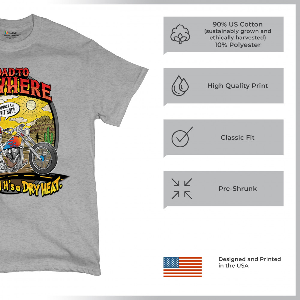 Our 'Road to Nowhere' tee is a salute to the thrill-seekers and the heat-bravers. Adorned with a bold skeleton cruising down Route 66, it embodies the spirit of adventure with a touch of playful defiance. A statement piece for anyone who lives for the ride and laughs in the face of danger. Join the ride into the sunset with this daring design.