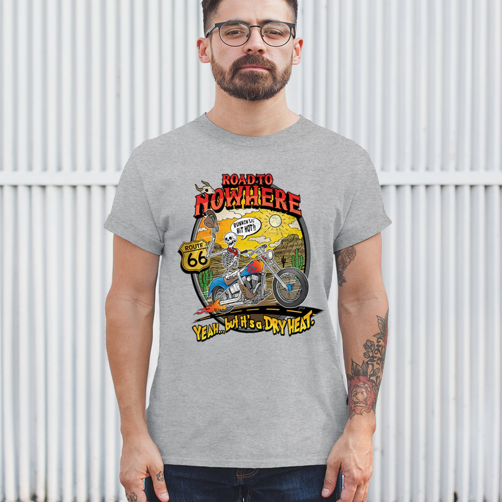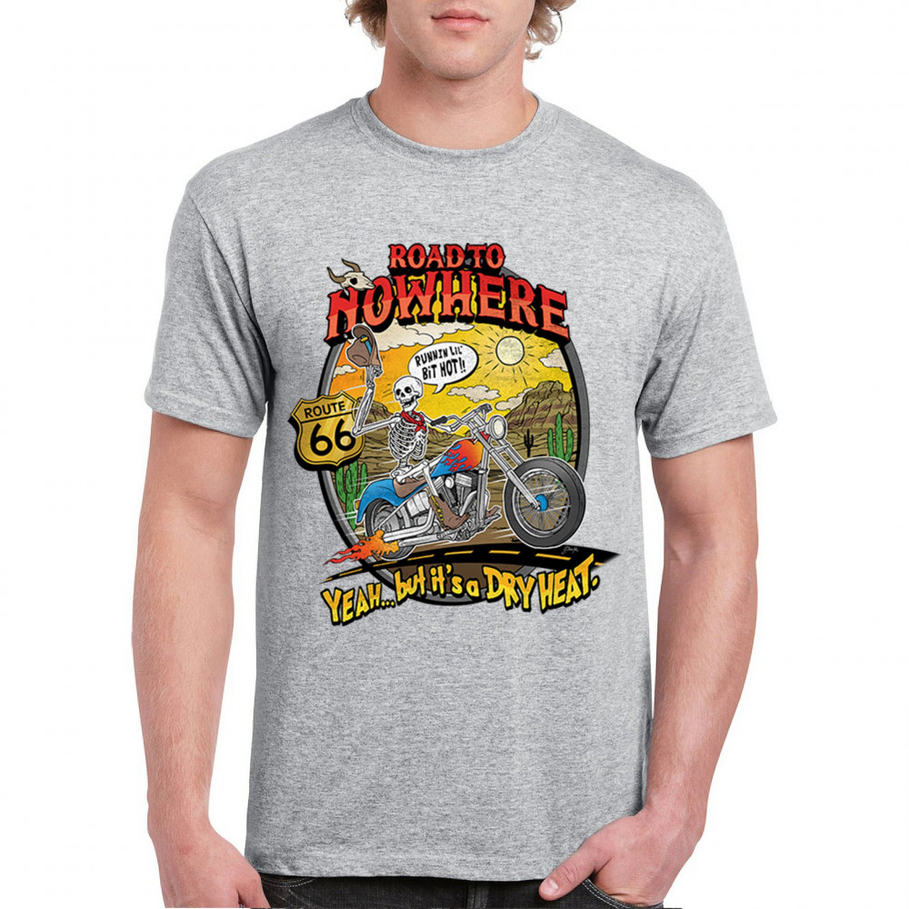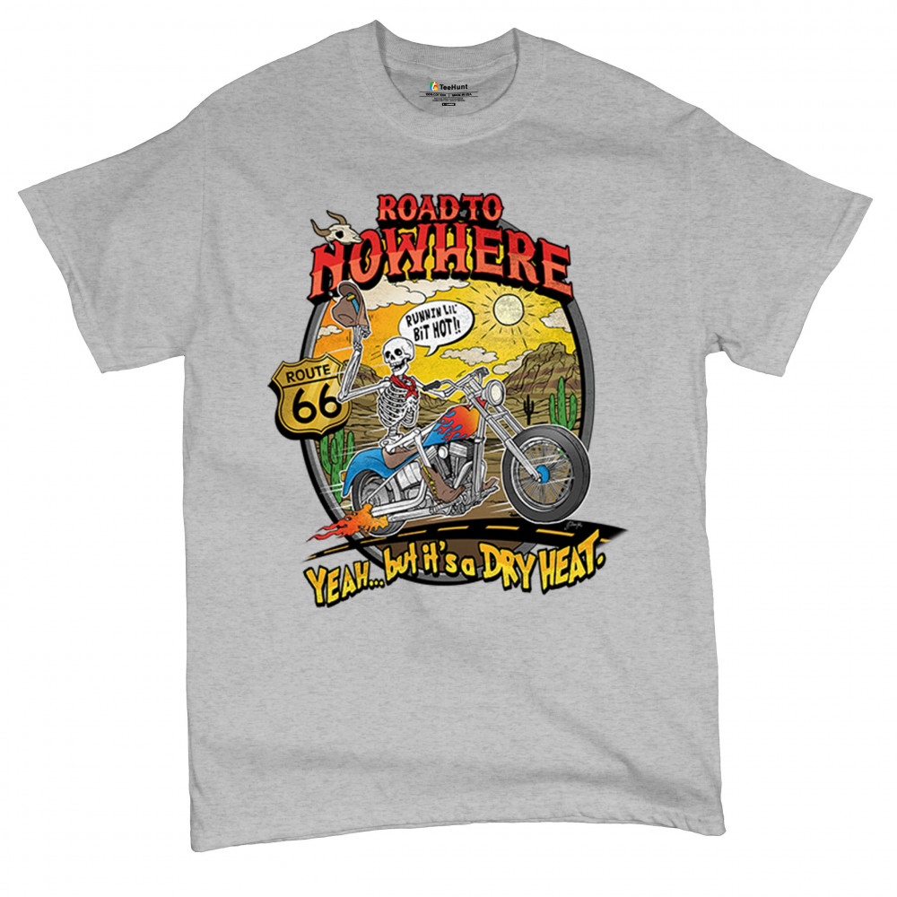 Discover the 'Road to Nowhere' T-shirt: a blend of bold graphics and adventurous spirit. Embrace the ride with our Route 66 skeleton biker design.