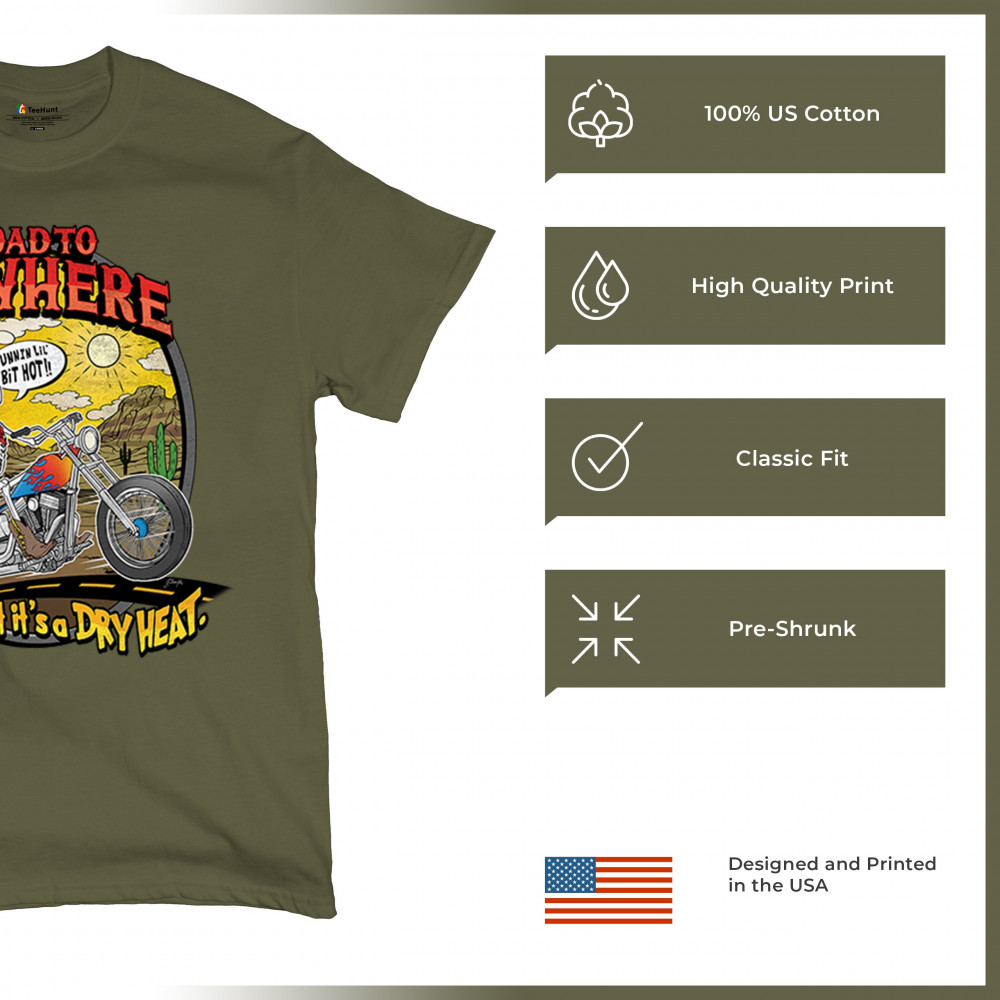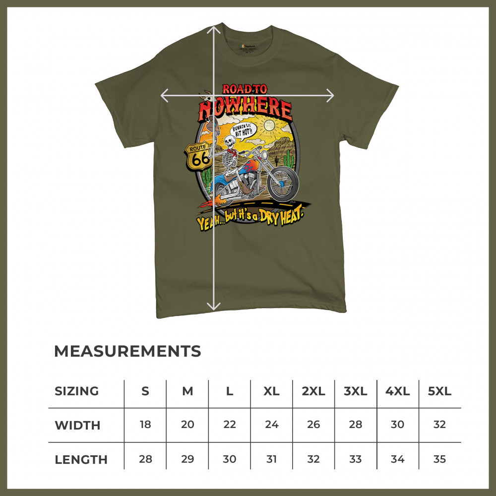 Our 'Road to Nowhere' tee is a salute to the thrill-seekers and the heat-bravers. Adorned with a bold skeleton cruising down Route 66, it embodies the spirit of adventure with a touch of playful defiance. A statement piece for anyone who lives for the ride and laughs in the face of danger. Join the ride into the sunset with this daring design.