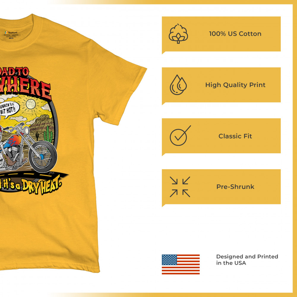 Our 'Road to Nowhere' tee is a salute to the thrill-seekers and the heat-bravers. Adorned with a bold skeleton cruising down Route 66, it embodies the spirit of adventure with a touch of playful defiance. A statement piece for anyone who lives for the ride and laughs in the face of danger. Join the ride into the sunset with this daring design.