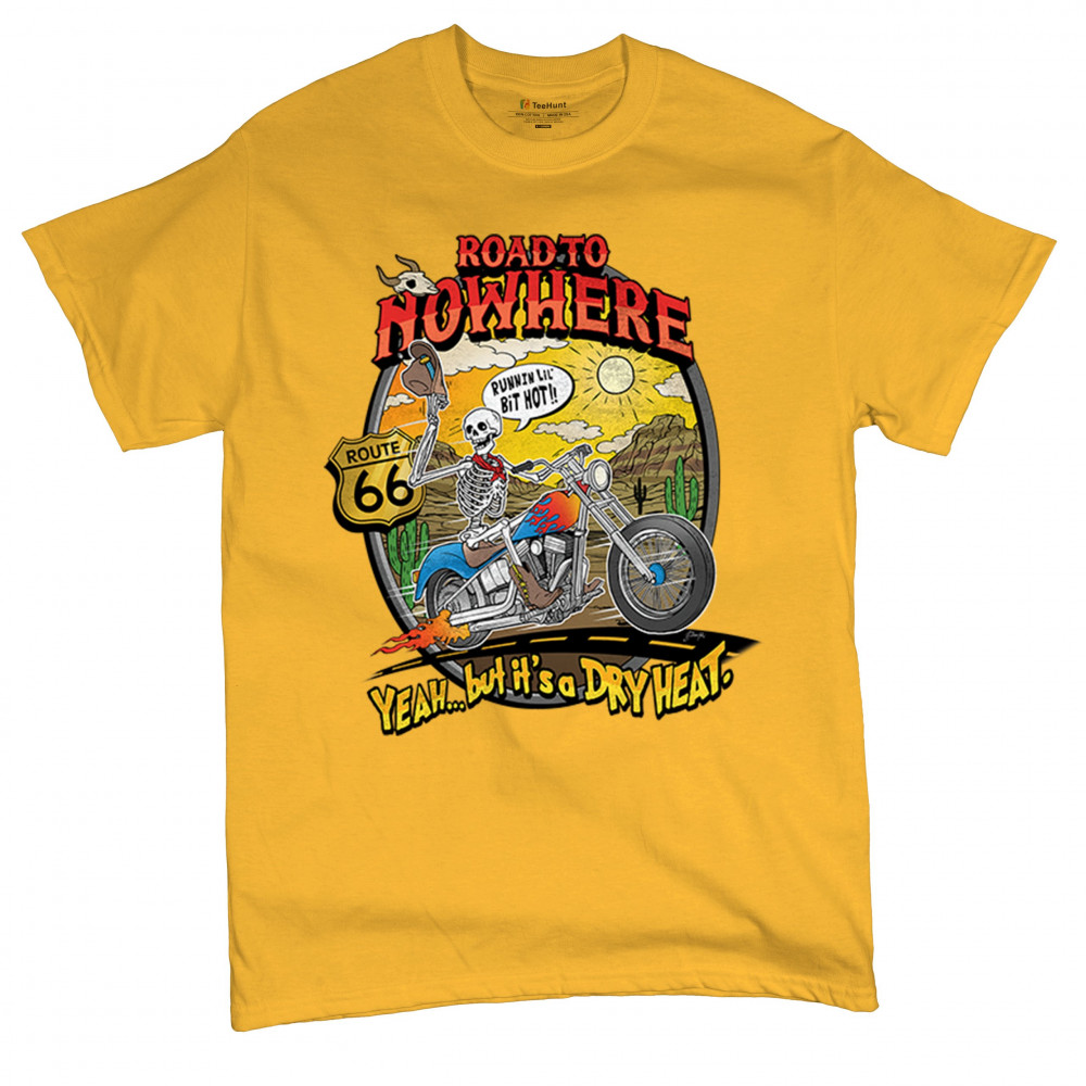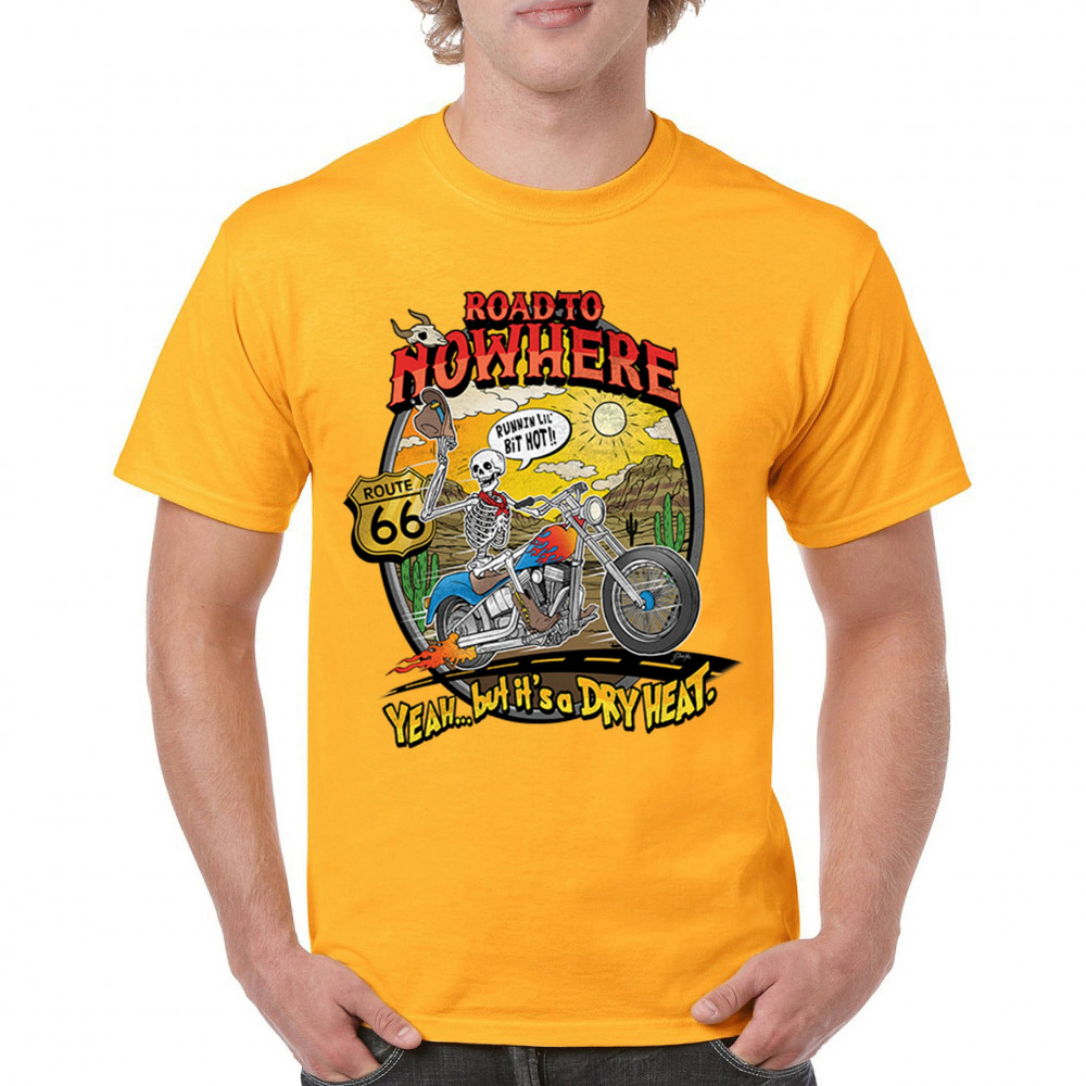 Discover the 'Road to Nowhere' T-shirt: a blend of bold graphics and adventurous spirit. Embrace the ride with our Route 66 skeleton biker design.