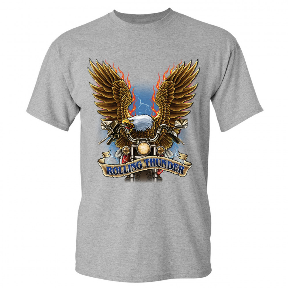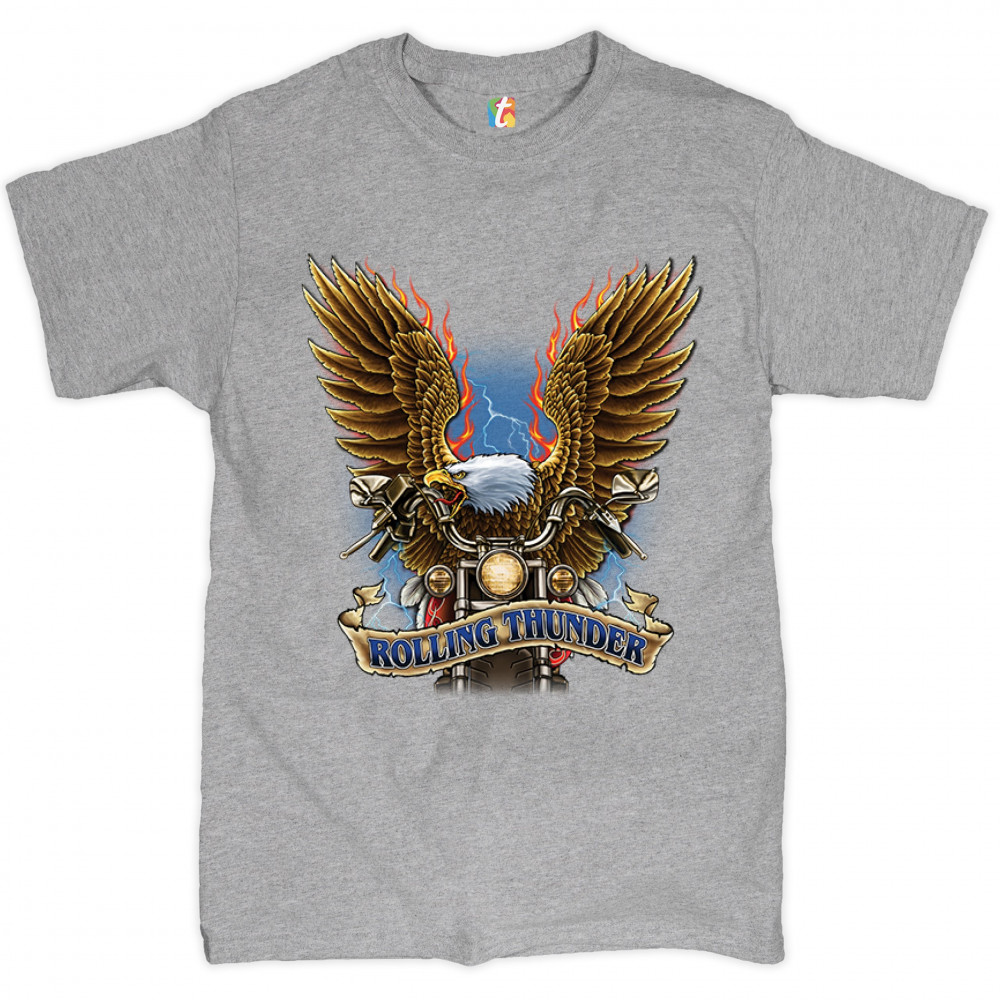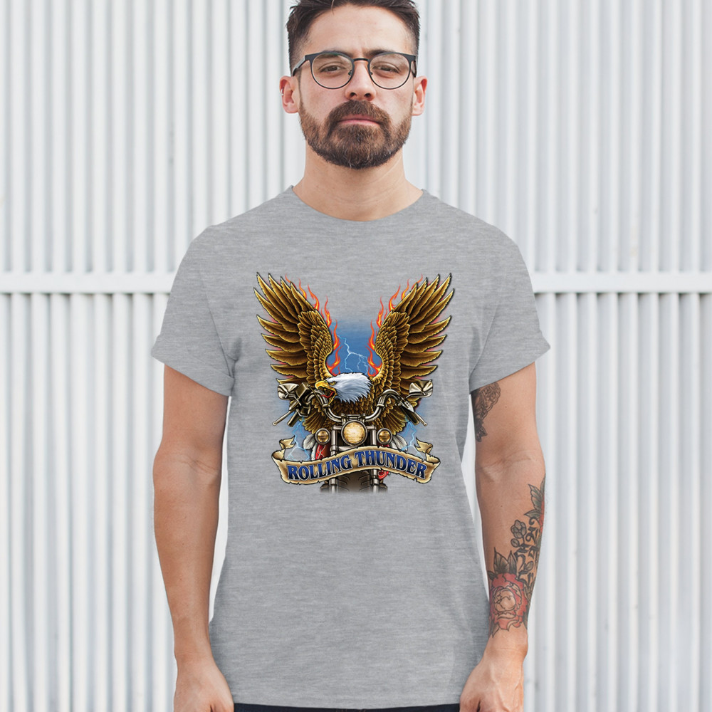 A print featuring an American bald eagle riding a motorcycle and spreading it's wings while they're on fire. In the background a lightning strikes. There is also stripe which says: "rolling thunder". A great choice for a motorcycle enthusiast.