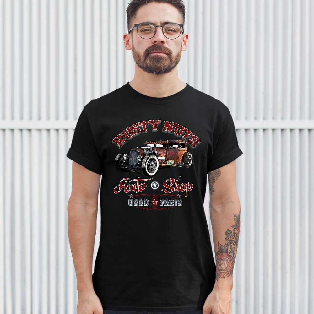 A print featuring a rat rod with an exposed engine. The print says: "Rusty Nuts, Auto Shop, Used Parts". A great choice for a fan of customized American classic cars and hot rods.