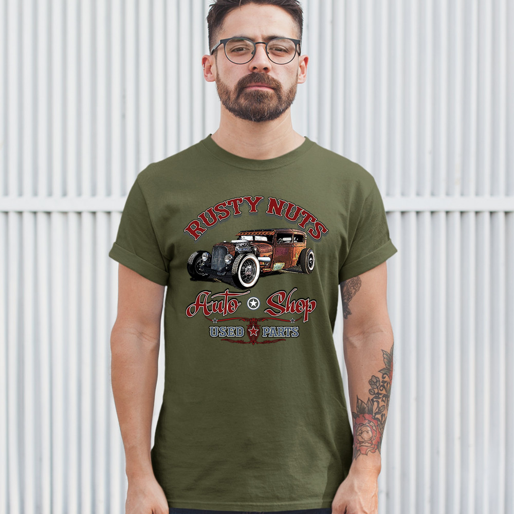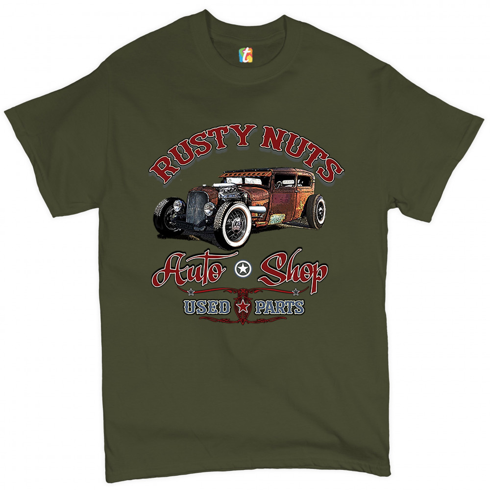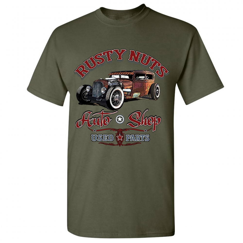RUSTY NUTS AUTO SHOP t-shirt hot rod rat rod vintage old school men's tee military green