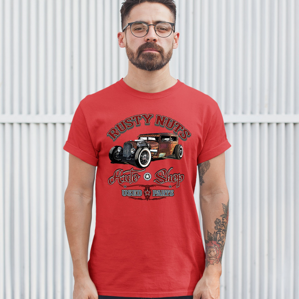 RUSTY NUTS AUTO SHOP t-shirt hot rod rat rod vintage old school men's tee red