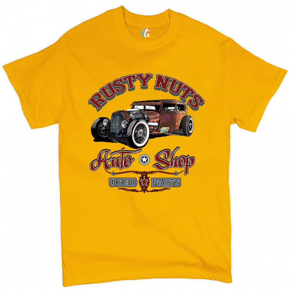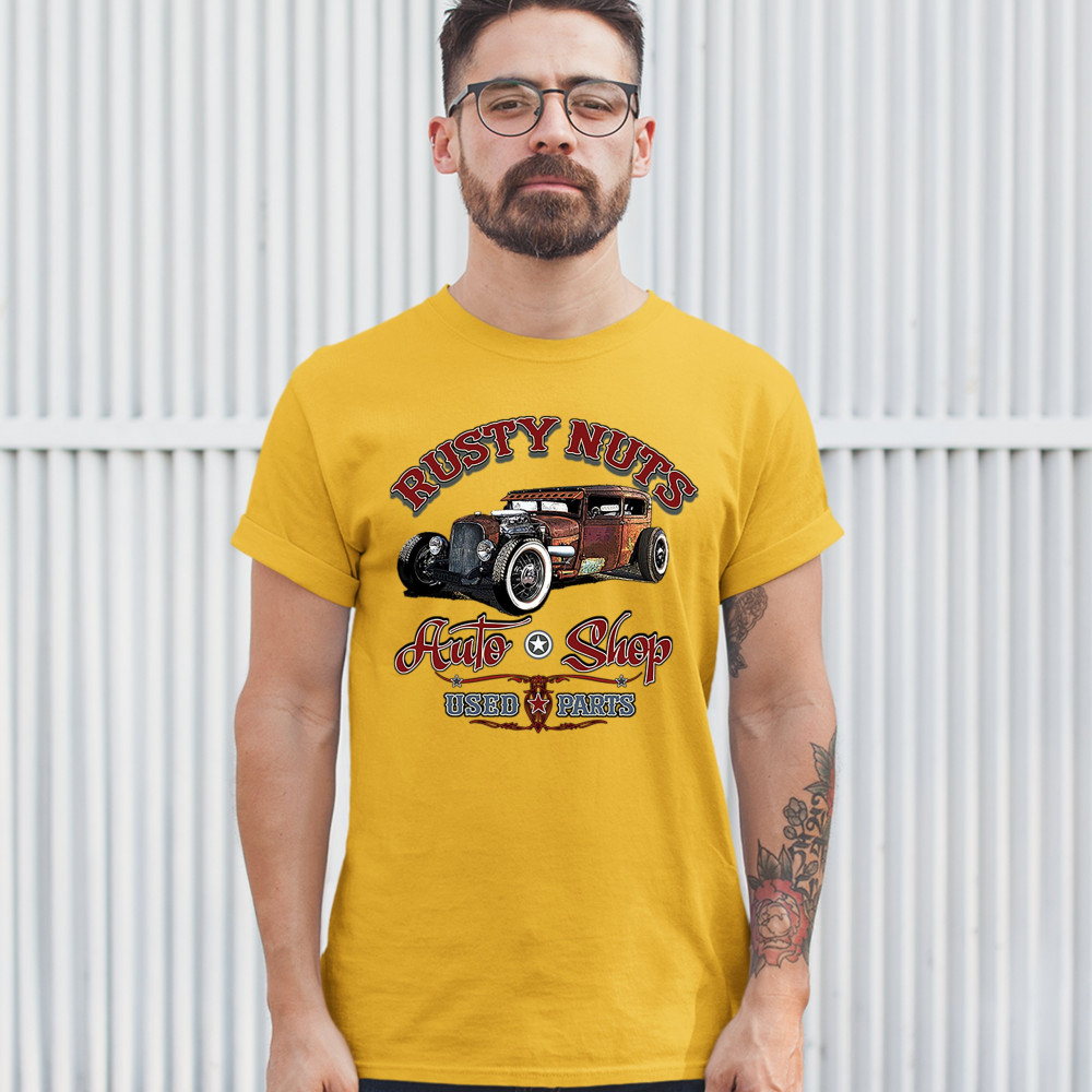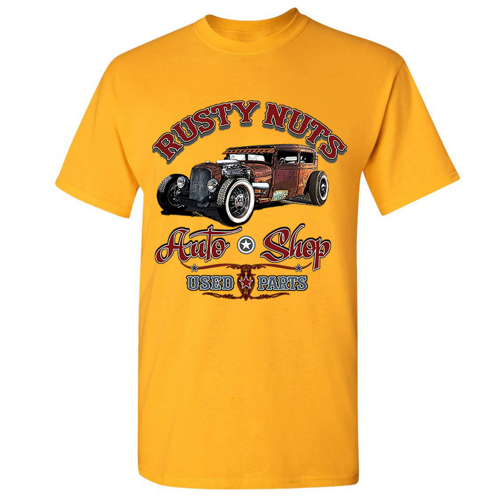 RUSTY NUTS AUTO SHOP t-shirt hot rod rat rod vintage old school men's tee yellow