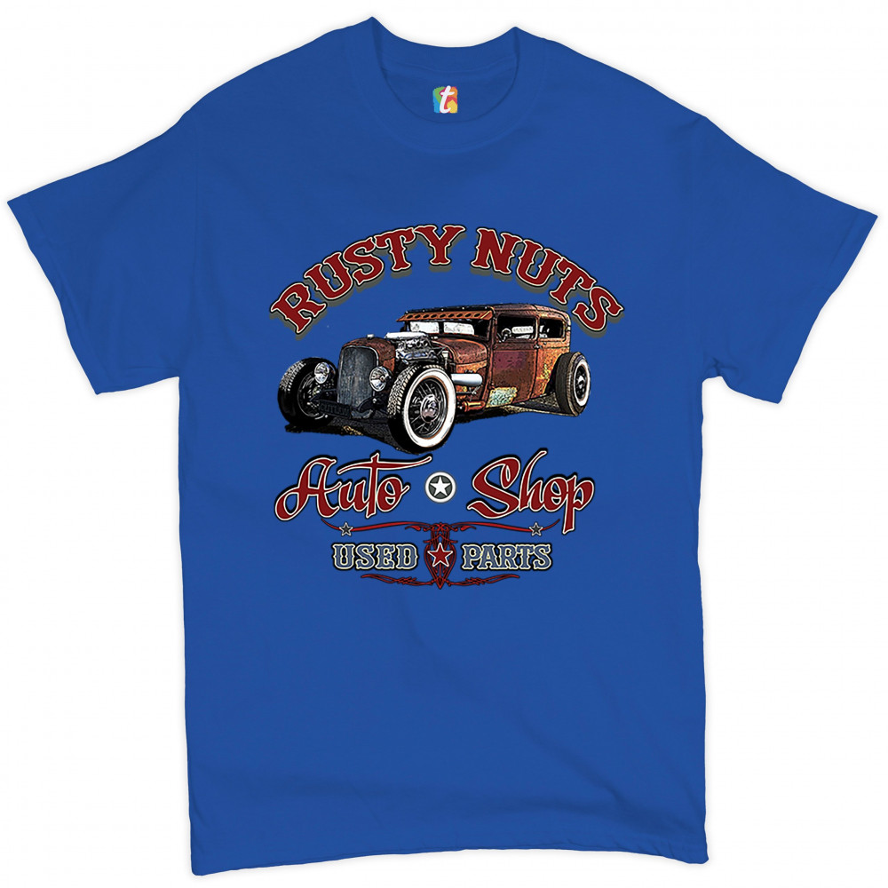 RUSTY NUTS AUTO SHOP t-shirt hot rod rat rod vintage old school men's tee royal blue