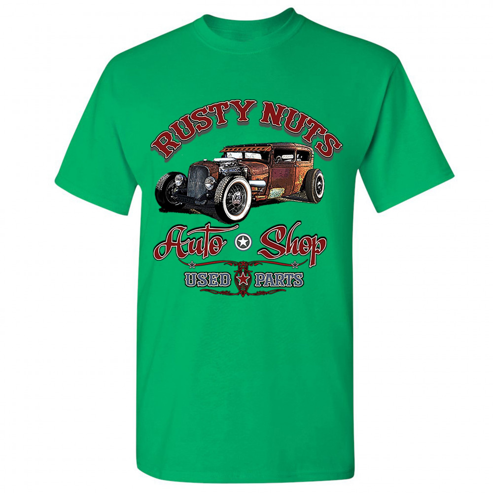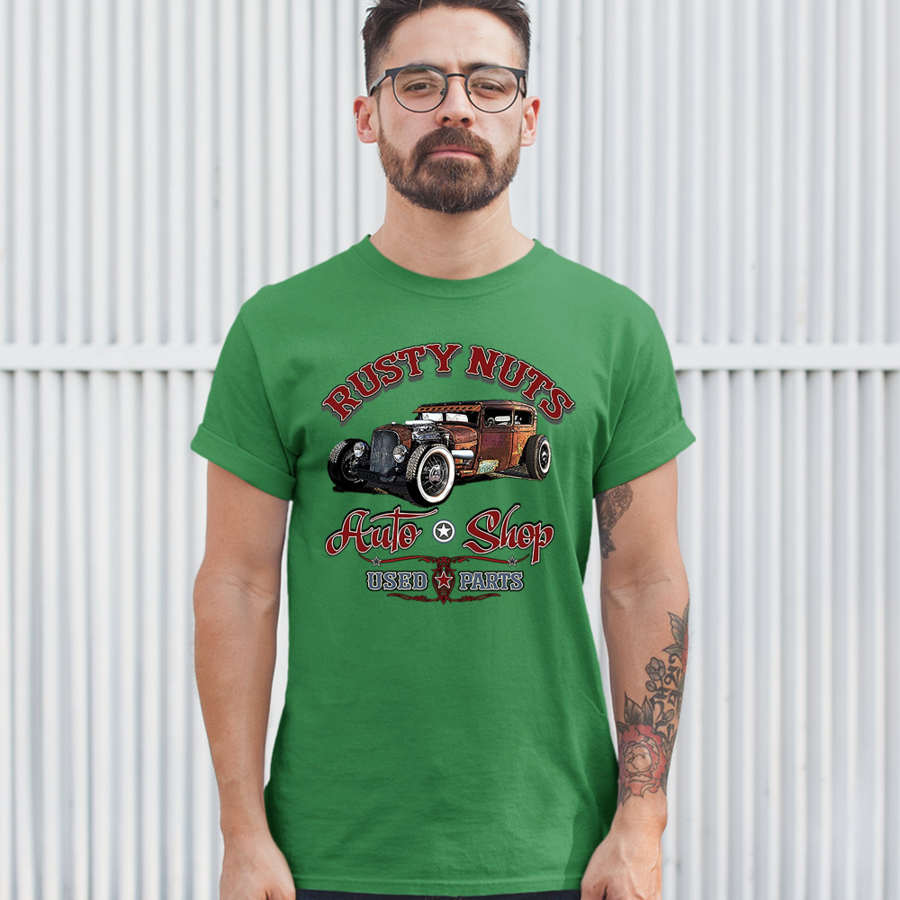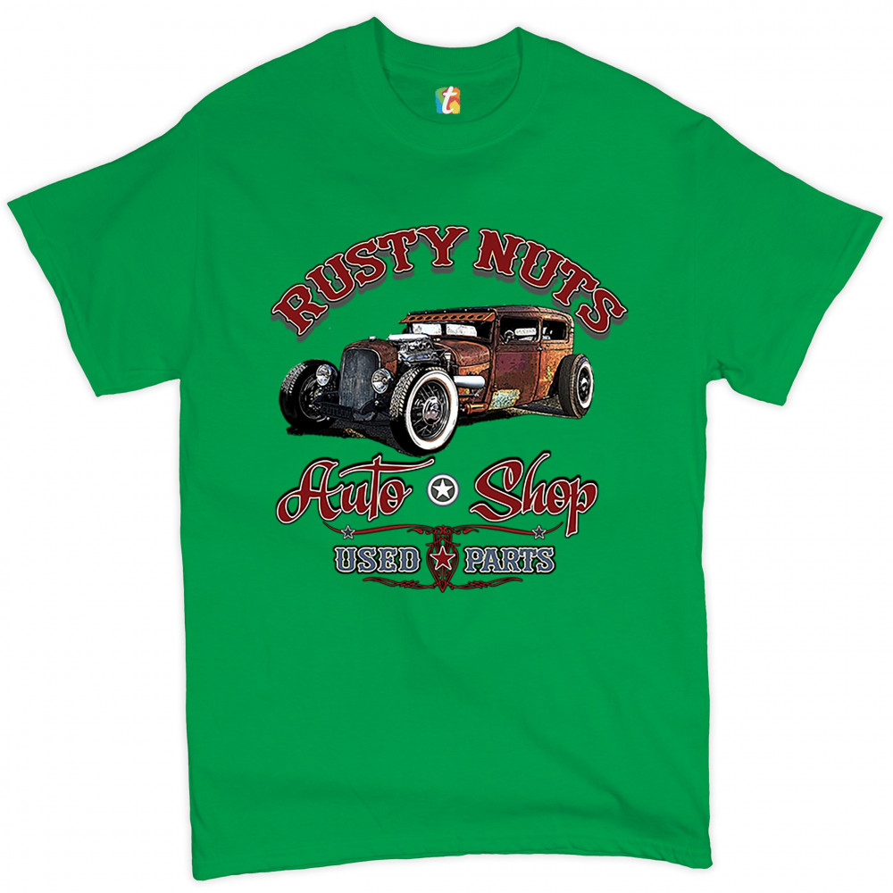 RUSTY NUTS AUTO SHOP t-shirt hot rod rat rod vintage old school men's tee green