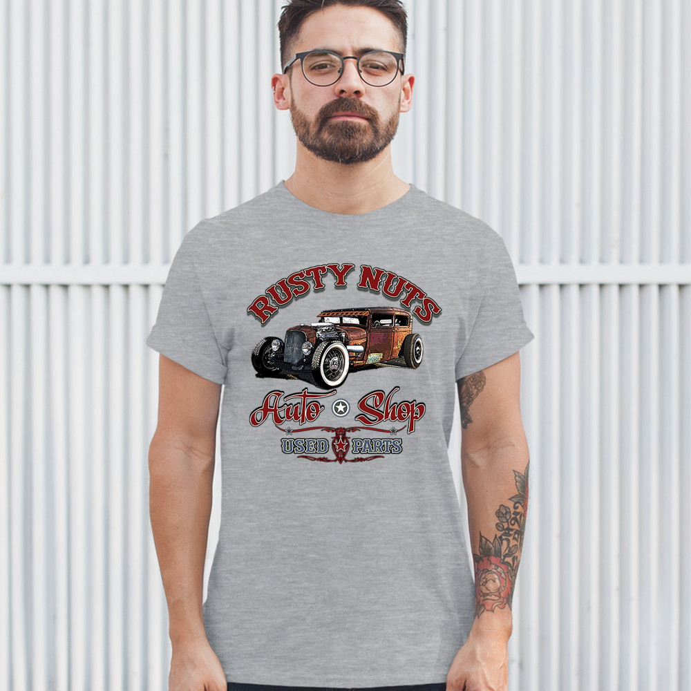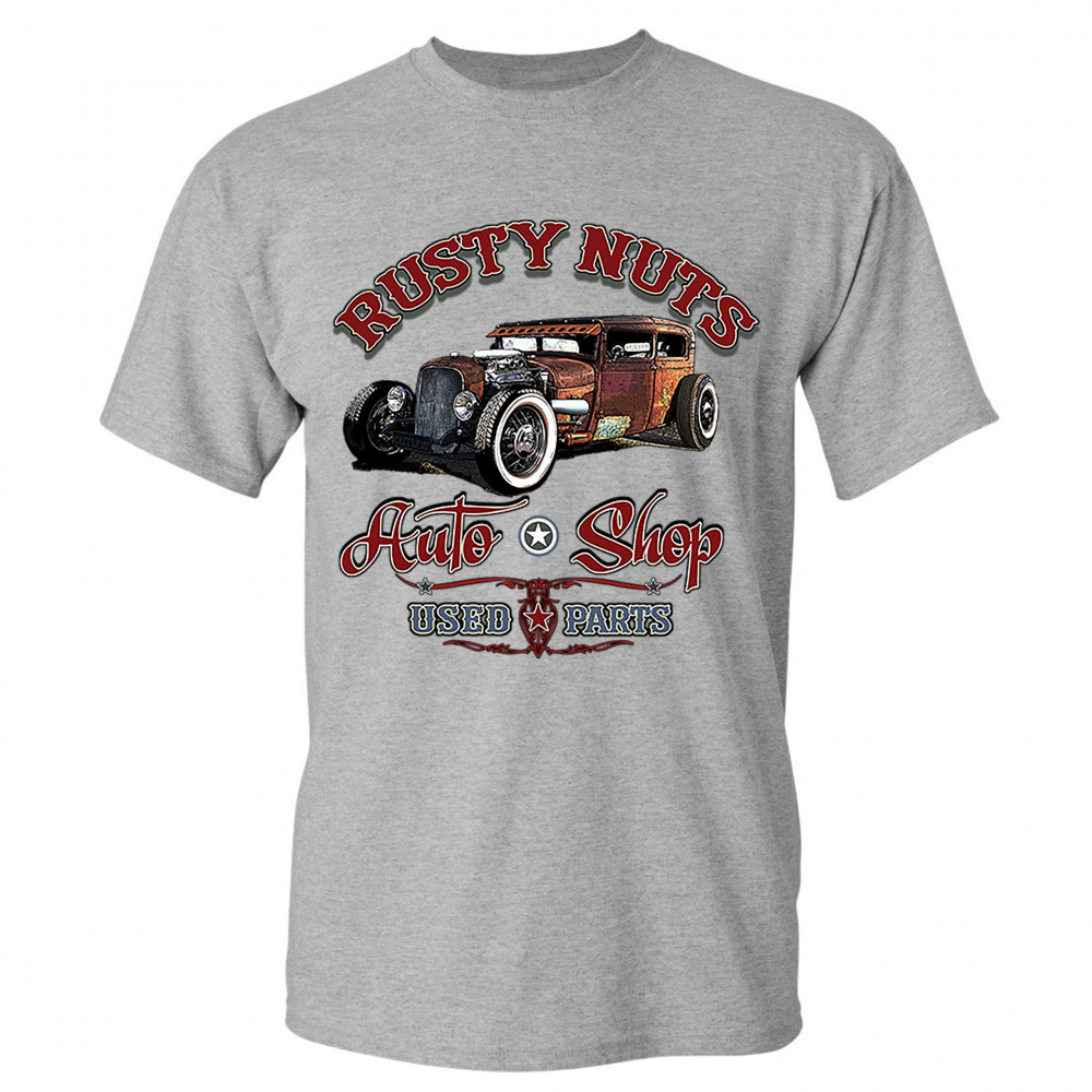 RUSTY NUTS AUTO SHOP t-shirt hot rod rat rod vintage old school men's tee gray