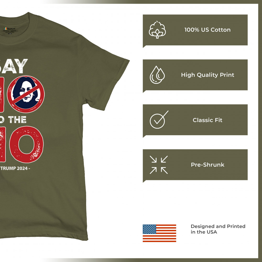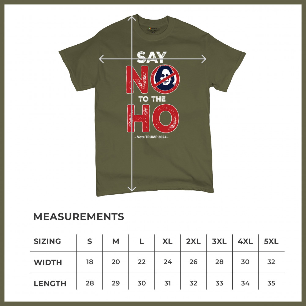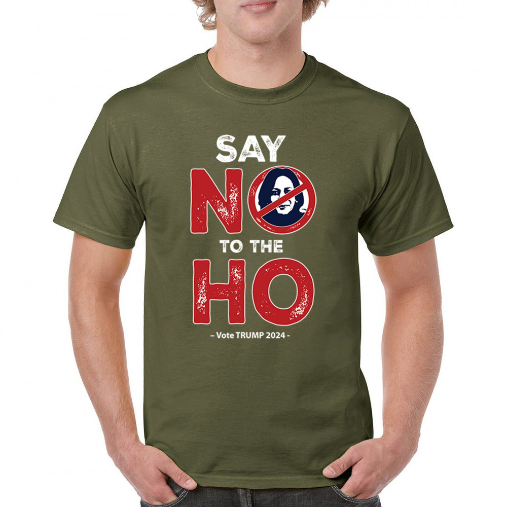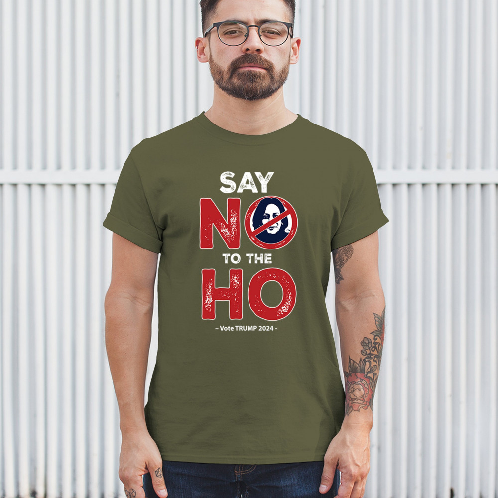 Show your conservative spirit with the "Say No to the Ho" print, perfect for rallies or daily wear. Support Trump-Vance 2024 and Make America Great Again.