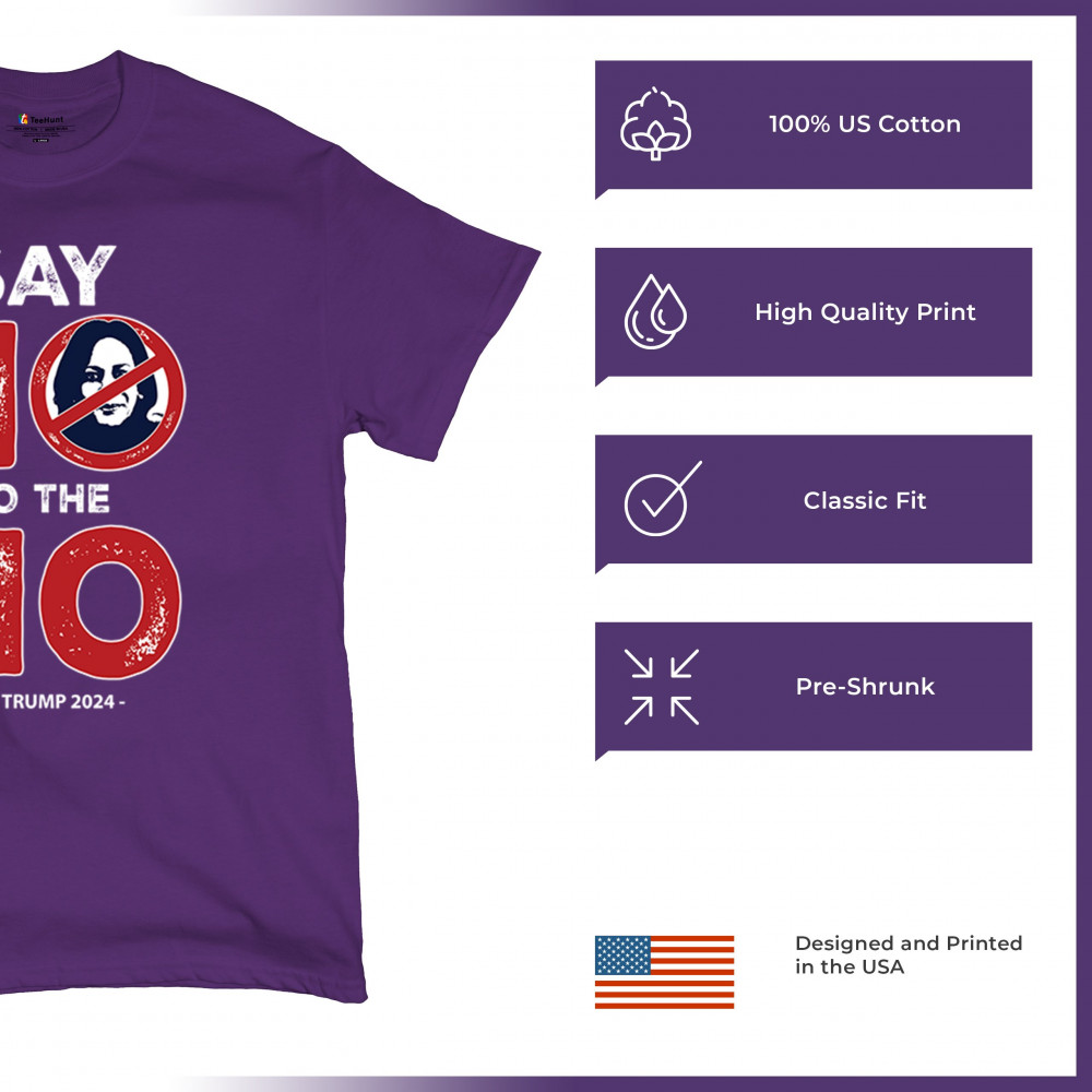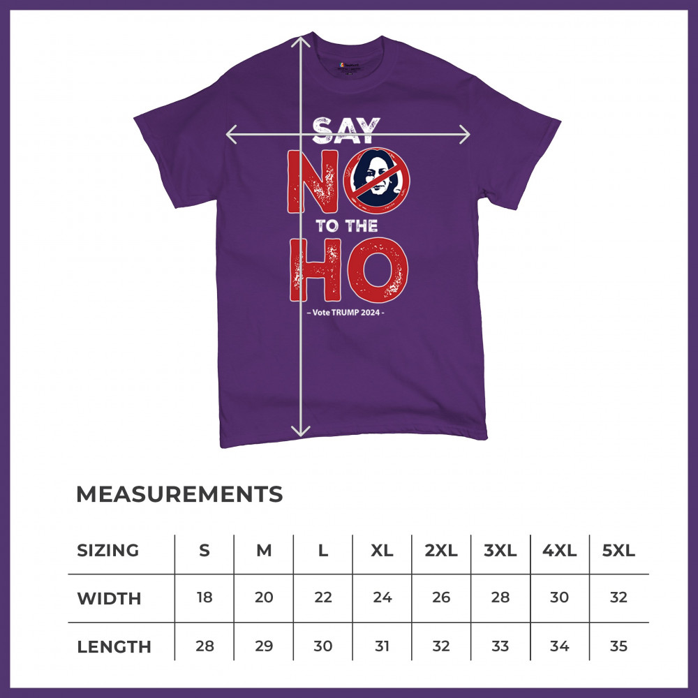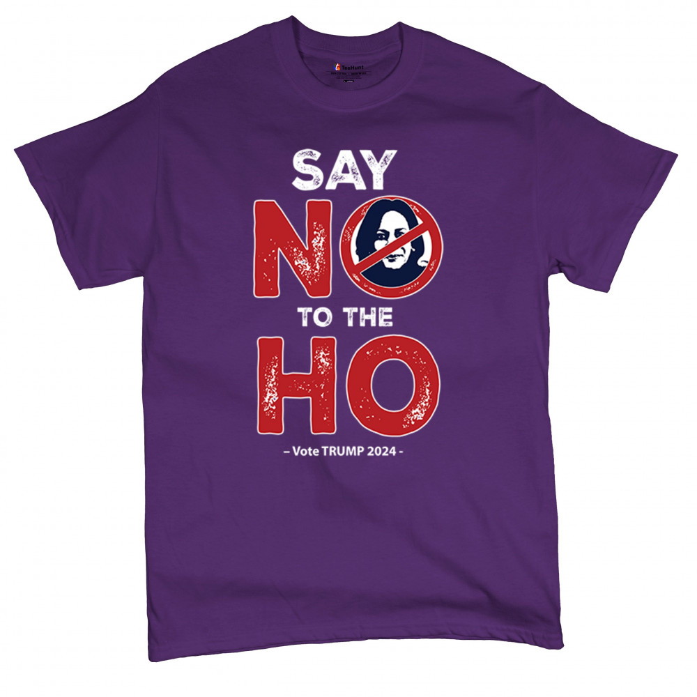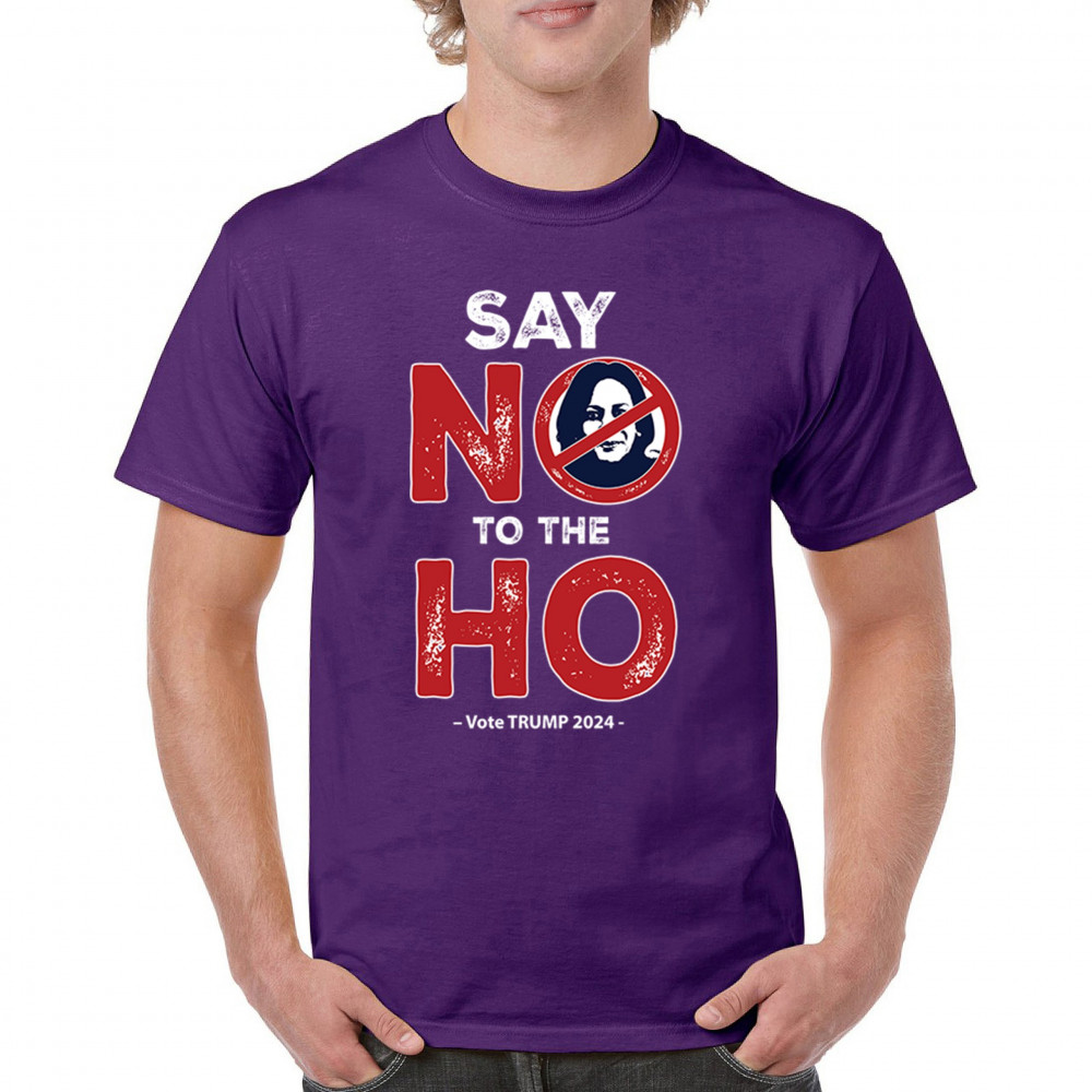 Show your conservative spirit with the "Say No to the Ho" print, perfect for rallies or daily wear. Support Trump-Vance 2024 and Make America Great Again.