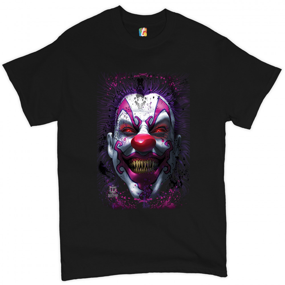 A print featuring a scary face of a grinning clown, exposing huge sharp fangs. A great choice for a person who is into horror movies, haunted houses and Halloween parties!