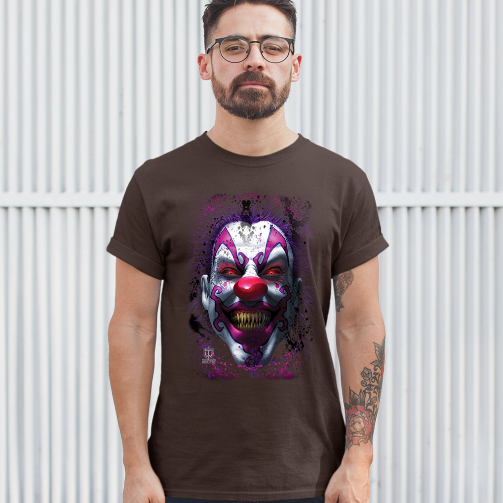 A print featuring a scary face of a grinning clown, exposing huge sharp fangs. A great choice for a person who is into horror movies, haunted houses and Halloween parties!