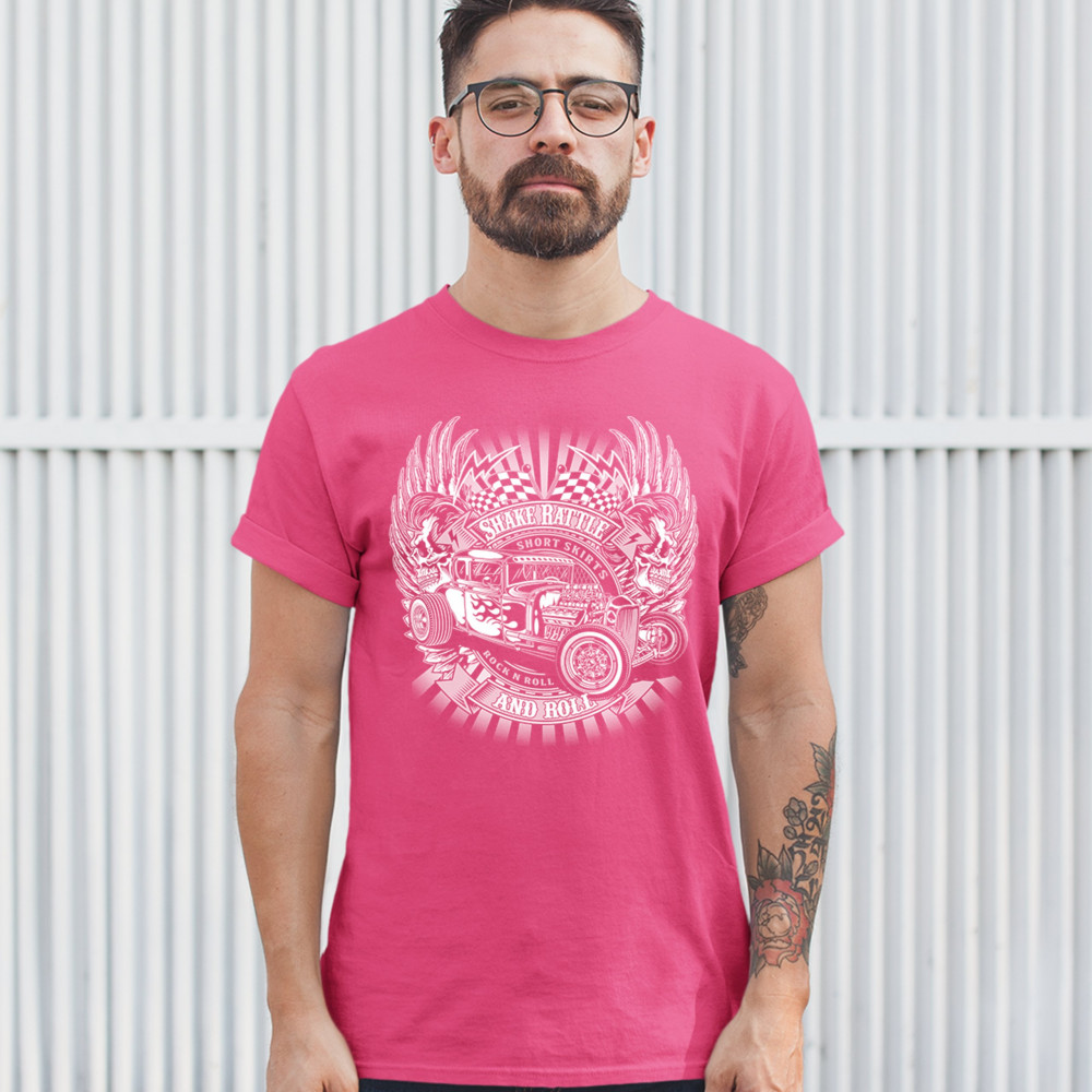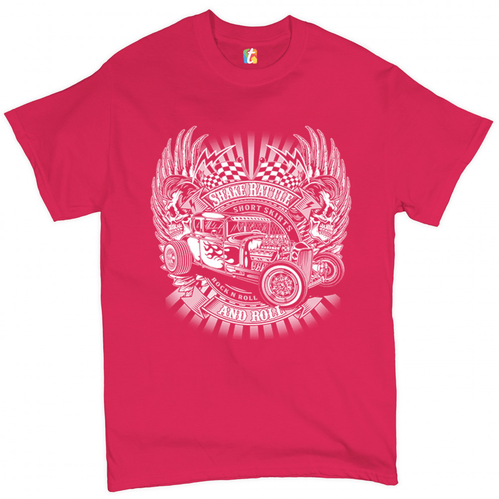 A print featuring a vintage hot rod with an exposed engine, a pair of skulls, wings and racing flags. On several stripes it says: "Shake rattle and roll", "short skirts" and "rock and roll". A great choice for a fan of customized American classic cars and