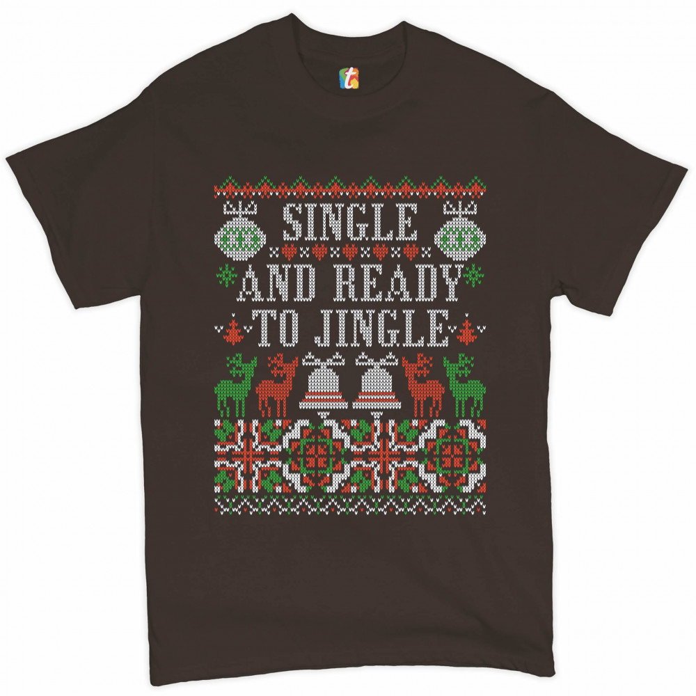 A print saying: "Single and Ready to Jingle" and featuring four reindeers and two Christmas bells. The print is designed as an ugly sweater. Amazing choice for a single person who wants to make people smile and spread positive vibes on Christmas Eve.