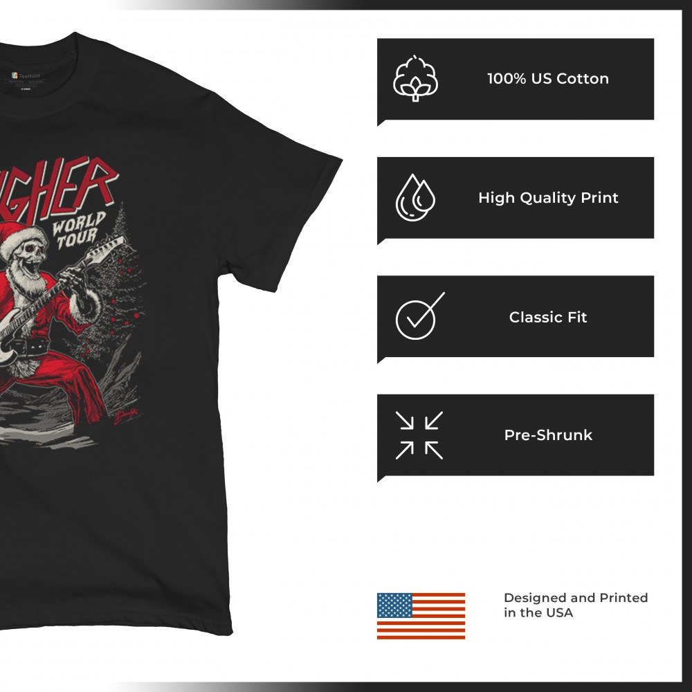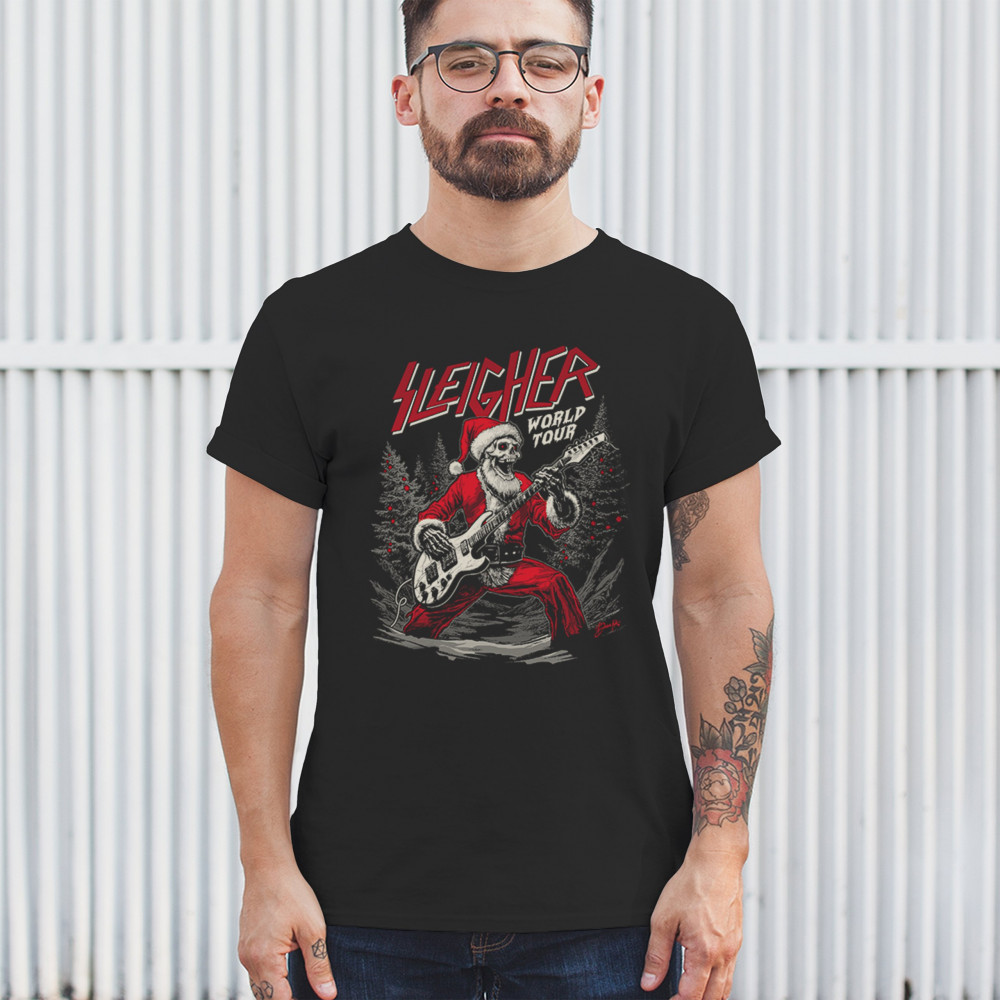 Rock the holidays with the "Sleigher World Tour" Santa skeleton design. Perfect for music lovers, holiday parties, and bold Christmas fashion!