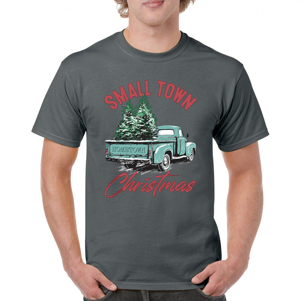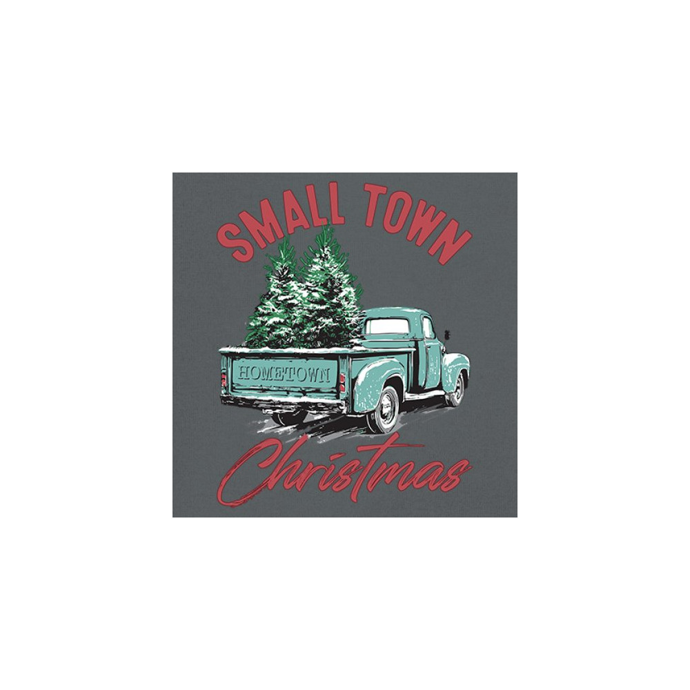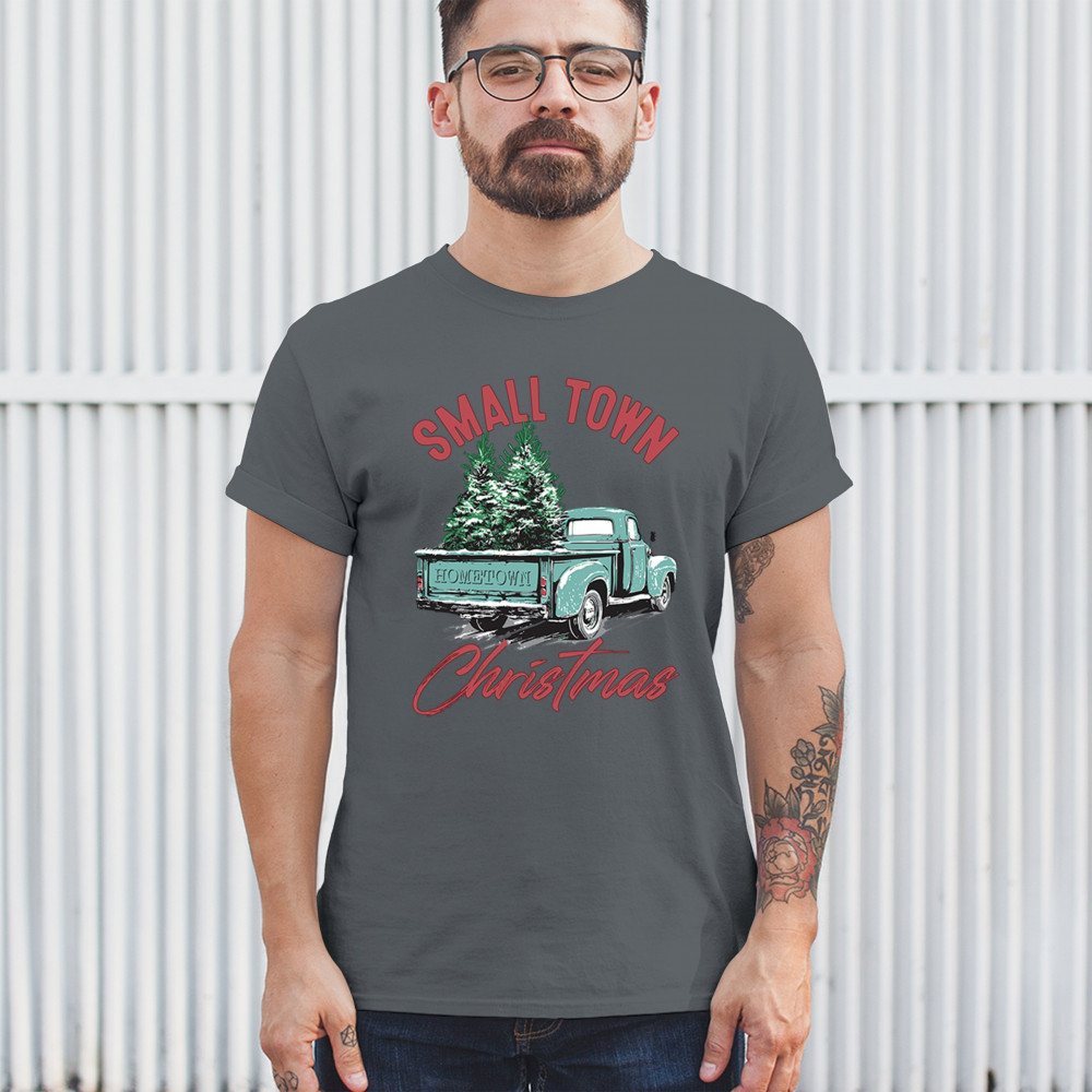 Embrace holiday nostalgia with this "Small Town Christmas" design featuring a vintage truck and Christmas trees. Perfect for rustic decor lovers.