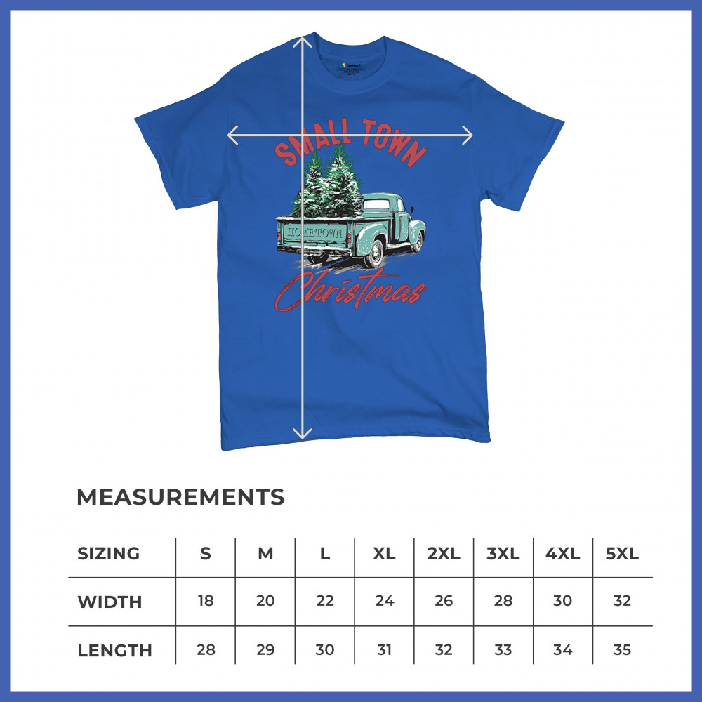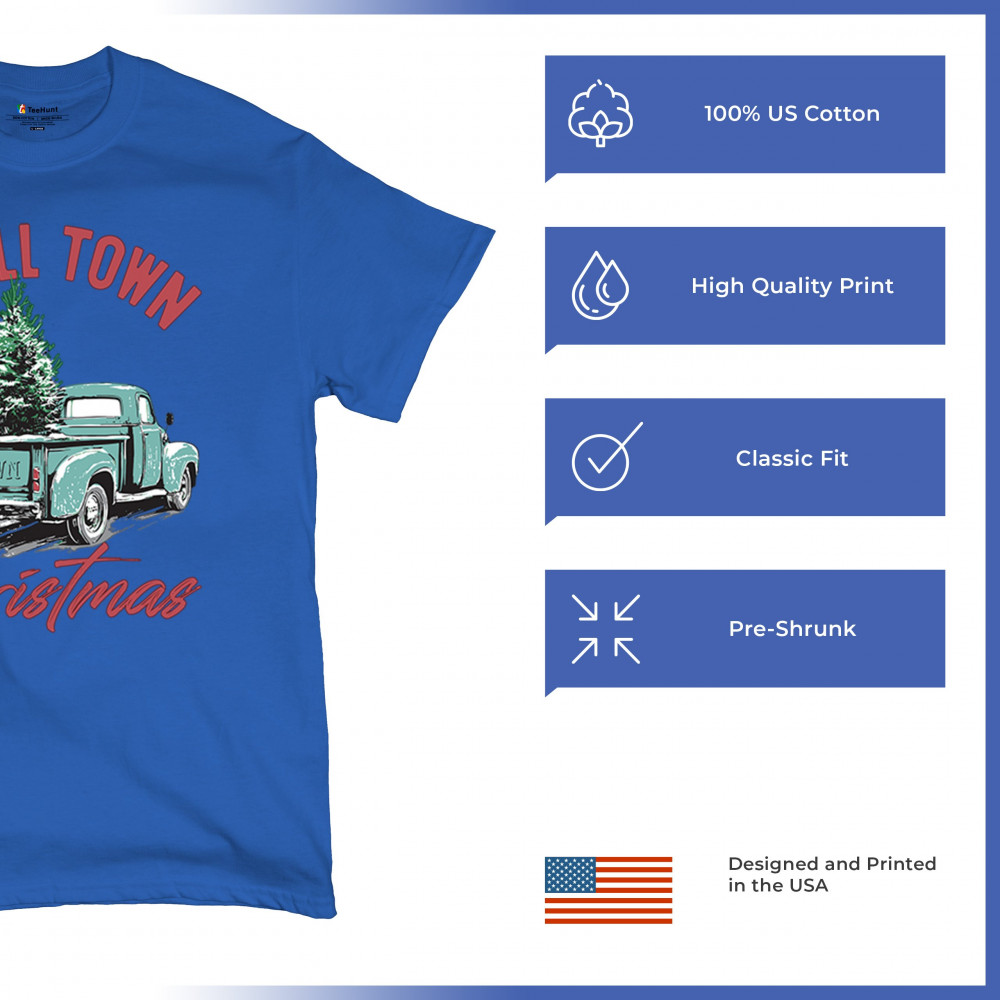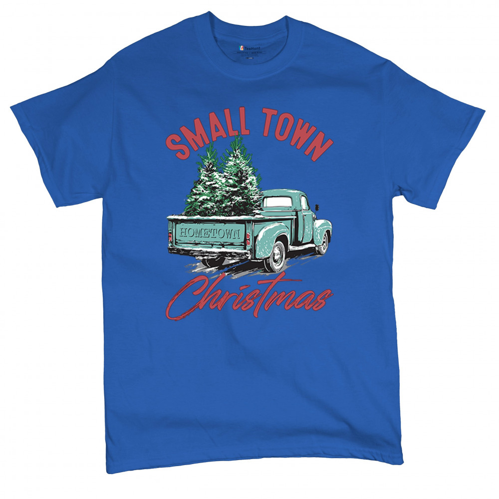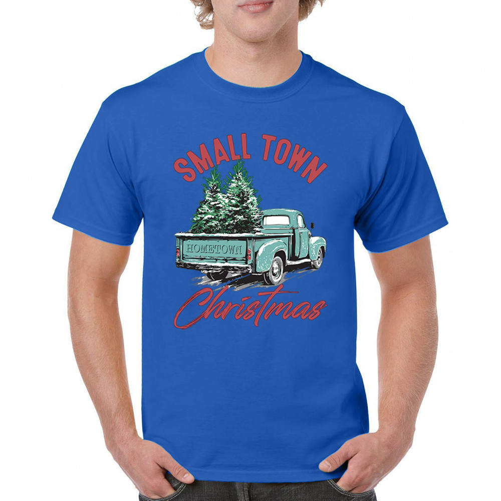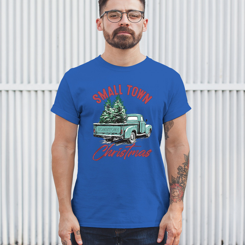 Embrace holiday nostalgia with this "Small Town Christmas" design featuring a vintage truck and Christmas trees. Perfect for rustic decor lovers.