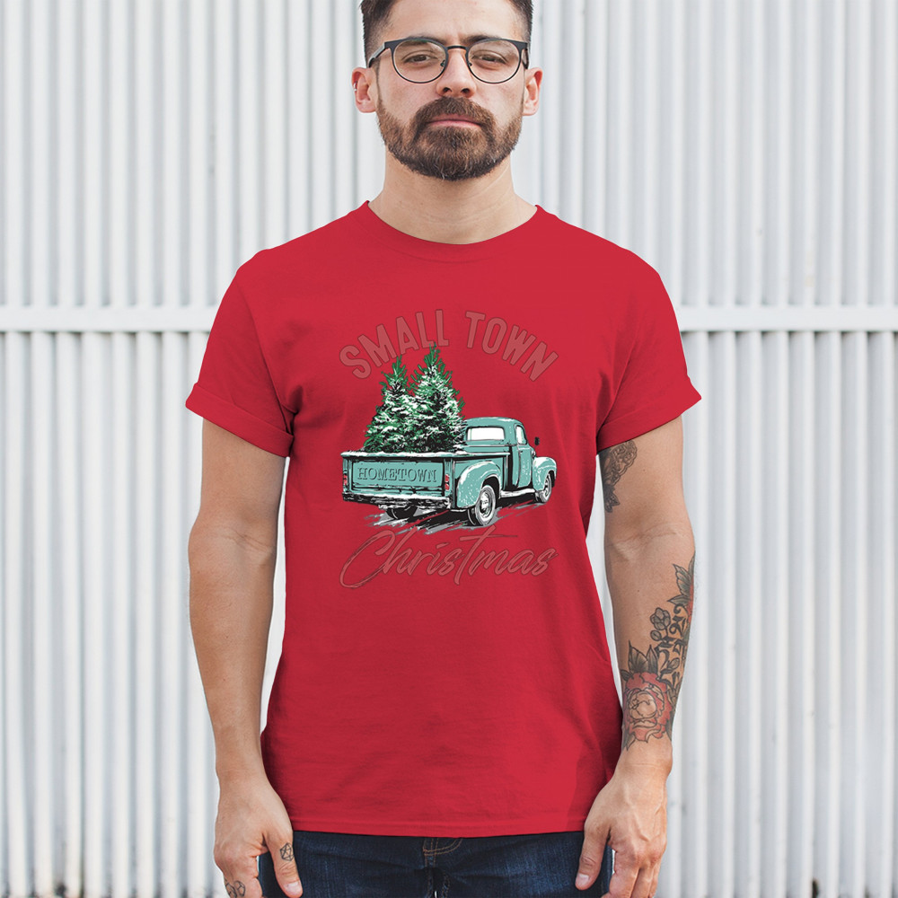 Embrace holiday nostalgia with this "Small Town Christmas" design featuring a vintage truck and Christmas trees. Perfect for rustic decor lovers.