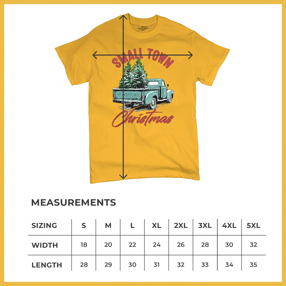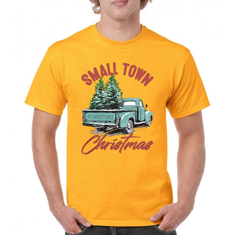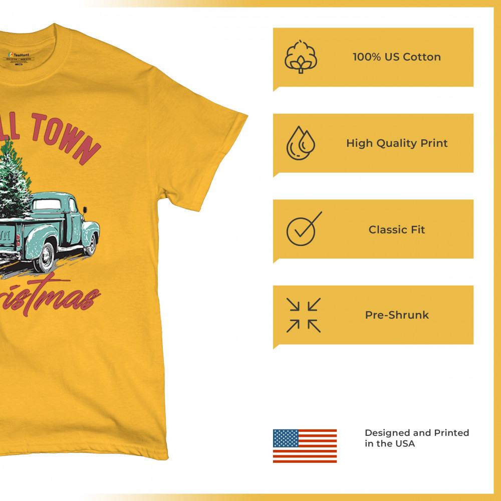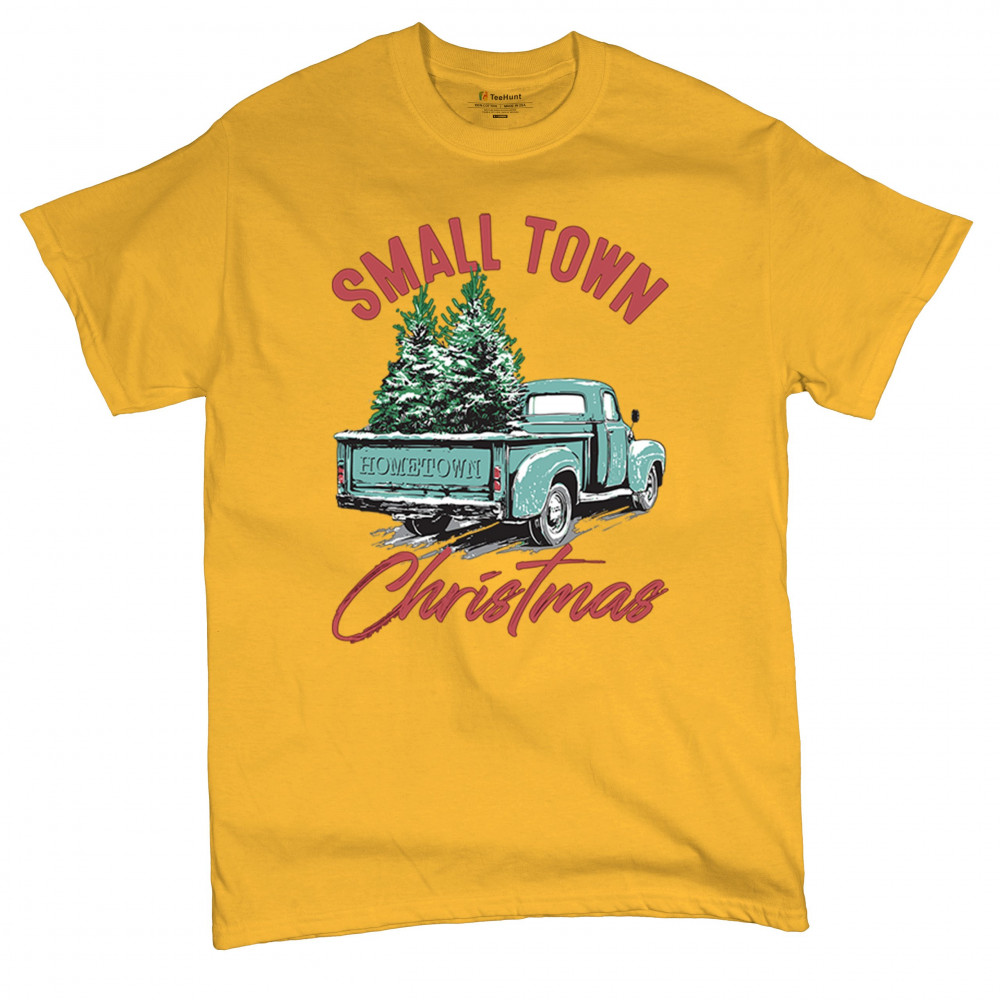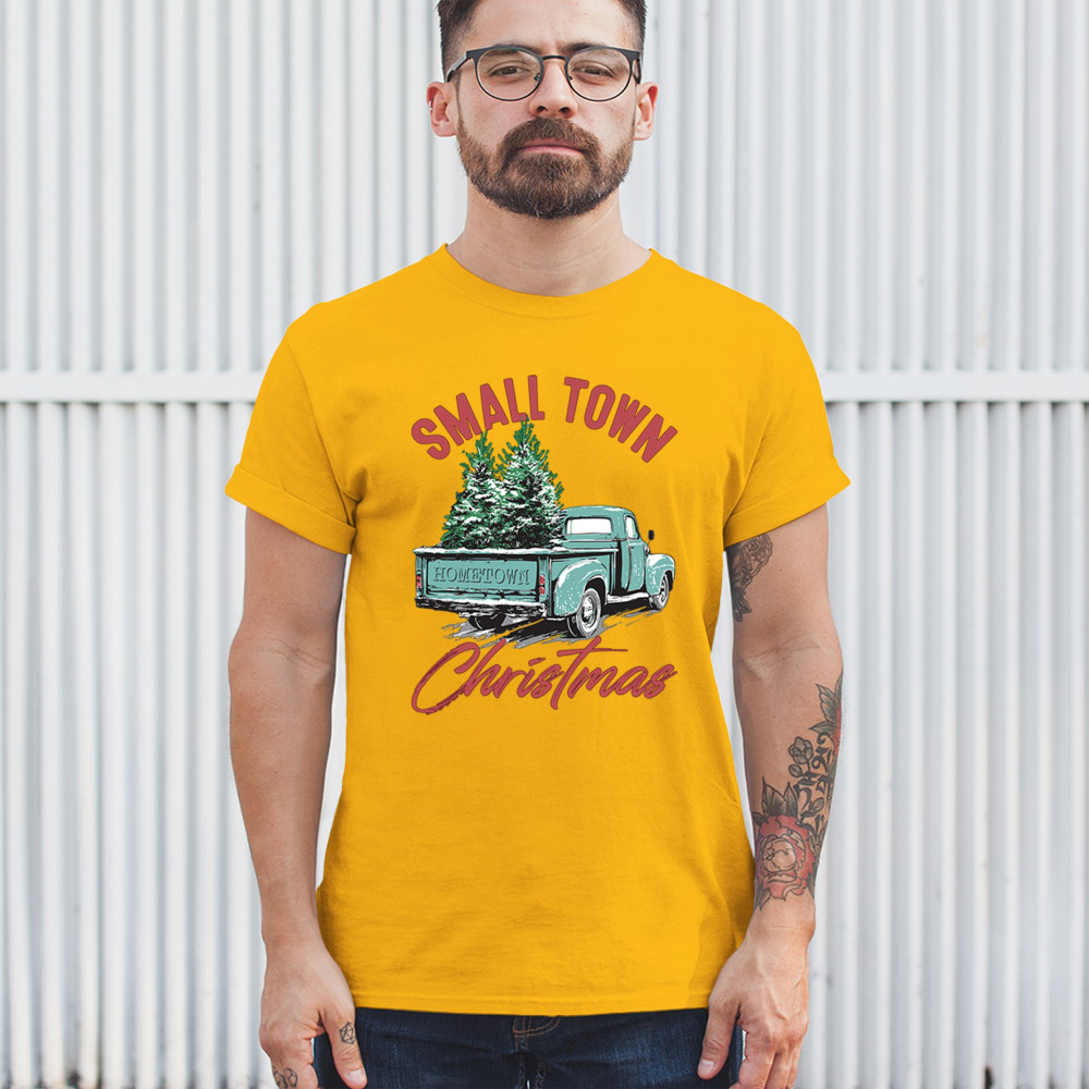 Embrace holiday nostalgia with this "Small Town Christmas" design featuring a vintage truck and Christmas trees. Perfect for rustic decor lovers.
