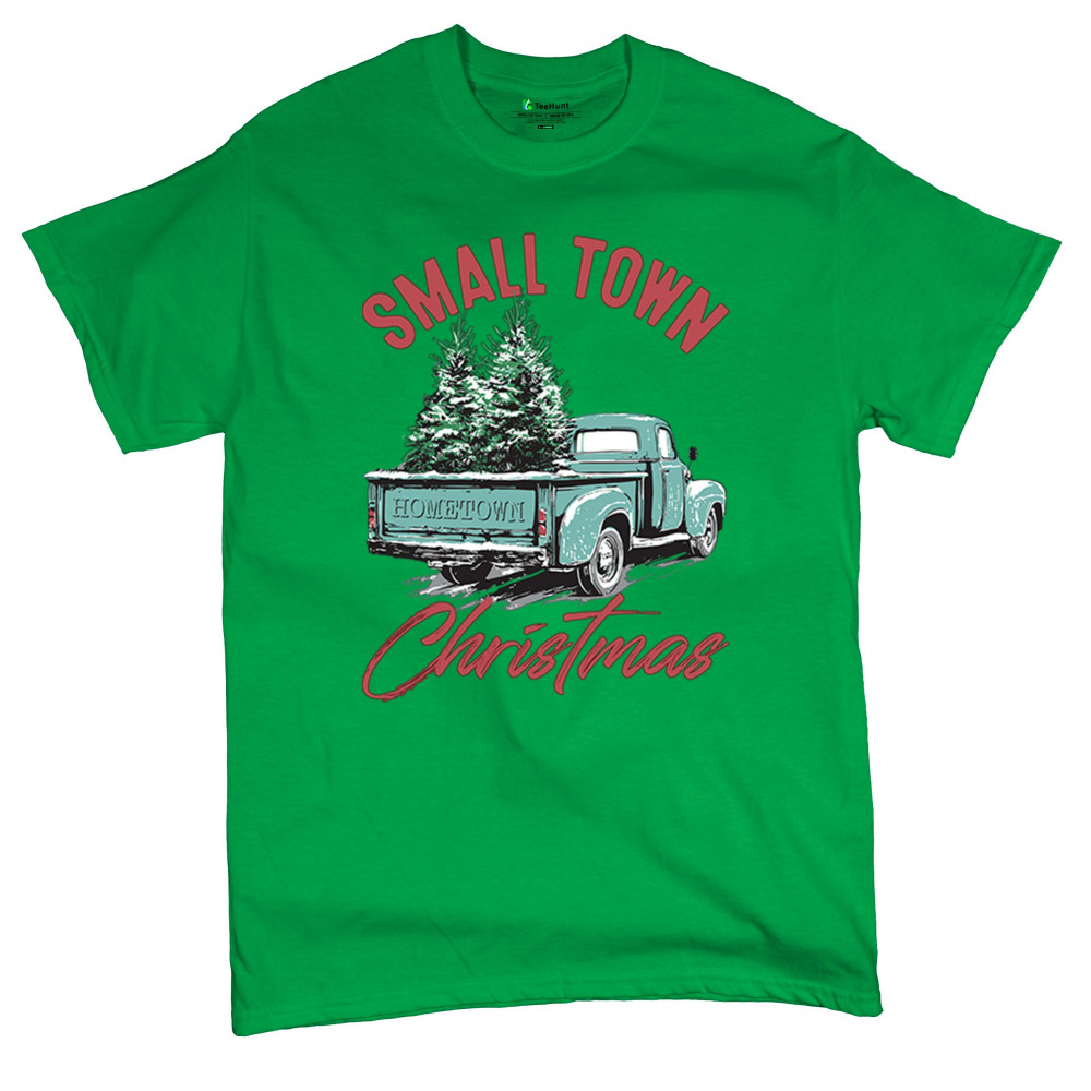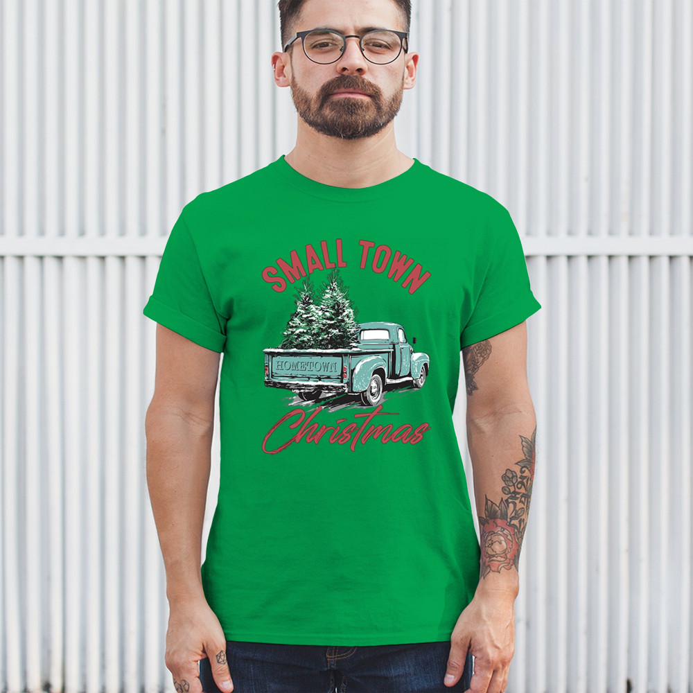 Embrace holiday nostalgia with this "Small Town Christmas" design featuring a vintage truck and Christmas trees. Perfect for rustic decor lovers.